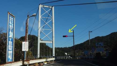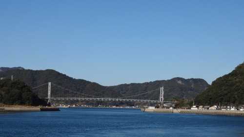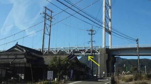 ループで橋を降りる、右側が漁村、釣舟、民宿など