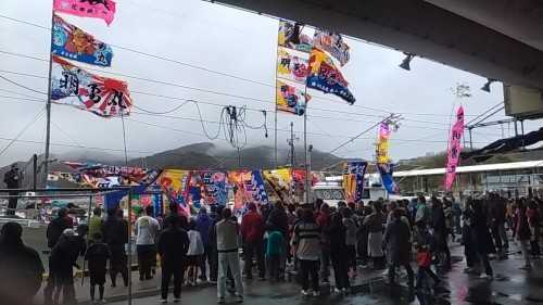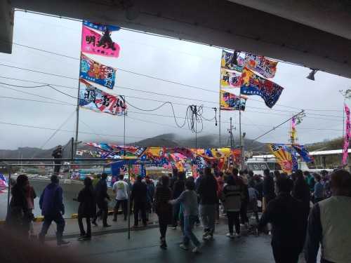 岸壁にはたくさんの出迎えだ(餅投げを拾う人)