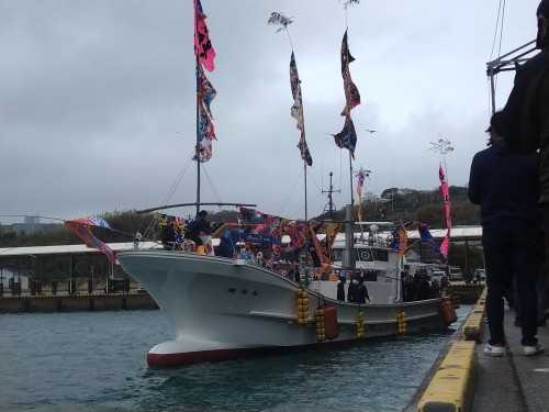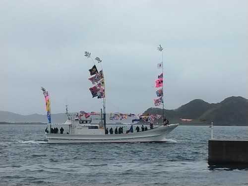 牛深の港では、新造船の餅投げがありました