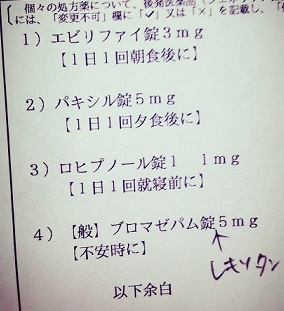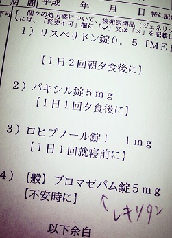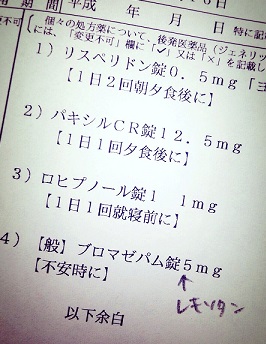 珍しく数日置きでの更新!この前通院日でした。話したことは特にはないけど、、というか苛々の話はしたけど 別に病気がどうこうって内容ではないので省略。パキシル5mgを、パキシルCRの12.5mgに変えてもらいました。パキシルでいうと10mg位なのかな?その他は変わらず、リスペリドン、ロヒプノール、レキソタン。ロヒプノールは1mgを1回2錠として処方されてるので、調整がしやすくて助かります。おかげで10錠くらいは普通に余らせてたんじゃないかな、確か。レキソタンも実は余らせています。効かなくなるのが怖いので極力飲むのを避けてるので、こちらも10錠くらいは余らせたはず。医者や薬剤師には言いませんけどね。何かあった時の為にとっておくのです。
