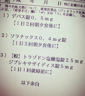 またまた少し久しぶりの更新。前回の更新以降レスタミンODが常習化してしまい、一気に1瓶(80~120錠)飲み干すようになってしまって。何が問題かというと、処方薬と比べて飲む量が多い事と、値段の高さ。だから最近はレスタミン離れしています。とか言いながらも明日また買ってこようかな、なんて考えているのですが。--------ここ2回分、診察時にお薬を多目に貰えてるんだ。あまりにも不安定だから、ソラナックスとジプレキサを倍量処方してくれてる。おまけにレキソタン5mgも処方してくれてホクホク。現在の処方薬はソラナックスレキソタンジプレキサアキネトンレスリンマイスリーレクサプロ です。