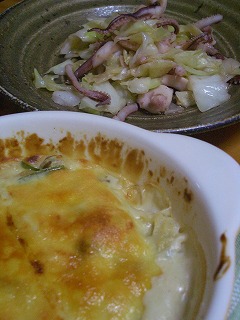 ♪昨日7月5日の晩ご飯♪切干大根と鶏肉のグラタンイカとキャベツのにんにく塩炒め * 以前に見たどなたかのお料理ブログで知った切干大根をグラタンにするというメニュー。ミルクで育ったにも拘らず牛乳が大嫌いになったらしいマイの為にこのメニューを思い出し作ってみた。なんと美味しいこと!!!!!クリーム系と切干大根が合うなんて(´▽`)ノ♪絶対にまた作ると思われる。もちろんお嬢さん、完食♪♪ * 曇りだったけど雨ではないので、張り切ってママチャリ乗って児童館へ行くと昨日の雨で一日中おうちで過ごしてストレスを溜めていた親子で満員だった。私達もそうです(;´▽`)` 子供達はガンガン遊び回り母達はガンガンしゃべりまくりみんなスッキリしてお帰りになりました。さ、午後からも頑張ろう!