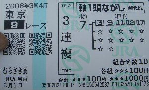 NYダウ高騰。 NIKKEI225Fも寄りは250円GUの14600円スタート(ミニは14605円)でした。 エントリーは「売り」から....14600円。 どうして売りからさ....これも相場の癖とでもいいましょうか。 大きく上げた日はザラ場に下げる確率が高いんでございます。 しかし、FXにも目覚めているチキン之助といたしましては、為替の動きも気になります。 大きく上げた日はザラ場に下げる確率が高い・・・それなら、ドル円をはじめとするクロス円もザラ場に上げているときはどうなのさ・・・・ということになりますが、そのデータは取っておりませんでしたのでわかりません。 データを蓄積し始めた頃は為替なんて気にも留めておりませんでした。 今日は日本の株式市場の取引が始まってからも米ドル/円は上げ続けています。 いつもは米ドル/円が上げるとNIKKEI225F市場も敏感に反応して上昇するのですが、今日は寄り直後に付けた14610円の高値を更新するどころか寄り値にさえ戻らず、ジリ下げ。 それが不気味。 ジリ下げといっても安値は寄り値から70円下げたところが当面のレジスタンスラインでしたが。 後場反転する可能性は高いと思われます。 が、できるだけ今日も寄り引けの戦法を続けてみます。 いつも、わけのわからない相場の話で、せっかくリンクしてくださっている方には申し訳ありません。 今日は「競馬」の話も少々。 先週東京競馬場にて「ダービー」がありまして、枠連で辛うじて取らせていただきました。 土日には競馬サイトもやっていますので、G1はぜひとも取りたいレースです。 会員さんは現在20人足らず。一時は50人ほどおりましたが募集も全くしていないので減る一方です。 その中で古くからのファンがおりまして(現会員はすべて古いメンバーばかりですが)、私が付ける印に信頼を置いてくださる方です。 その方が、私の予想した印どおりで馬券を購入し、的中されたとの嬉しいお知らせをいただきました。 そして、その証拠写真も。 そのレースとはダービーの前に行われた 東京第9レース むらさき賞(芝1800m18頭だて) 印は6頭予想します 1番手評価・・・つまり本命が 馬番 7 2番手評価以降6番手までが 17,11,12,3,9 の順 結果は 7-3-17 の順でゴール板を通過しました。 馬連 49,530円 馬単 73,210円 3連複 76,790円 3連単 481,520円 3連複・3連単とも100円づつの投票ですが、合わせて558,310円の払い戻し。 獲ったぞ~って感じだったでしょうね。 私も獲りましたが、馬連と3連複だけでした。 3連単なんて、とてもとても・・・。 この馬券を買った方は九州の方なのですが、ご夫婦で競馬場へ行って観戦するのが好きで、この日も出かけたみたいです。 そして、私の印どおり買ったのが、奥様の方というからびっくり。 旦那さんは買ったのを知らなかったようです。