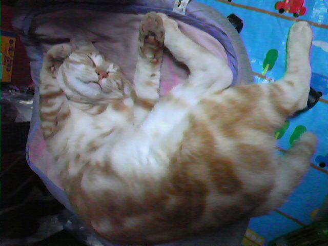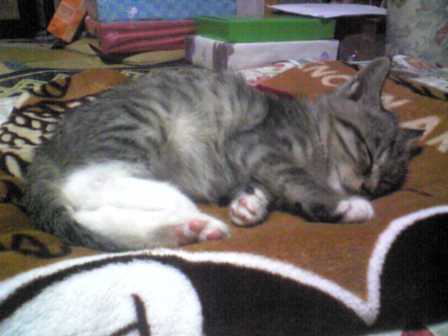 とら です。大きくなりました(σ`・∀・)σйё。 以前のと比べると.... ちょっと、フテブテしく見えます(‐゛‐;) 今日8日(もう、昨日か?)は消防の連合演習でした。 阿武隈川の河川敷で行うのでこの時期は、チト小寒いのですが、今日は、曇りから晴れ気温は最高20℃最低12℃とマズマズでした。数年前は霙が降る中、実地放水をした事も(;⌒▽⌒A かなり快適な演習でした。 しかし、今迄続いた晴れ間も今週は大体雨模様らしく、寒さにまた一歩近ずくのでしょうね(。v_v。) 何故、この時間に更新なのか...? じつは、演習の後に鱈腹生ビールを飲みつまみや定食も食べ、午後3時に自宅で仮眠。っと思いきや、時刻は午後10時に...爆睡でした!!(;゜ロ゜)ノ 「もう眠れんかも?」と思い、ラパンのガソリン残量もかなりの危険信号だったので24時間スタンドでガソリン1000円分(T_T)を入れました。しかし、ガソリンの値段て、なかなか下がりませんね?その足で某コンビニでスーパーカップの塩バターを購入。食べてから入浴。そして今に至るです。 あと約2時間でシモベ1号(♀高1)を駅まで送らねば...。 まろん はいつもオイラの布団で寝るのですが今はオイラの膝の上で寝ております(*´∀`*) ....ちょっと、寝てしまおうか?…(/へ\*)