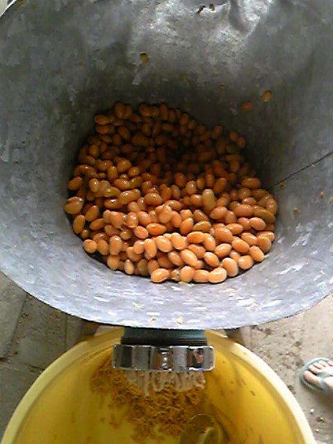 え~、続きデ━v(o´ з`o)━スゥ♪ 毎年同じですが、大豆を18キロを煮まして。 例のハイテクマシーンに入れて。 ぐるぐる~ってすると。 こんなん出ました。これだけでも美味しく頂けます(∩.∩) いっぱいになるまでシモベ1号とシモベ3号で 交代でやってました。専らσ´Å`o)オイラは撮影に専念しました(*σ゚ω゚)σYO !