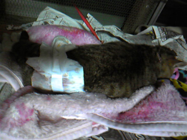 とら の画像ではありませんが、とら がストレス?でエサ入れをひっくり返した図です。 と、言ってる場合ではありませんでした! 土曜日に とら は病院で大手術を...。木曜日に恒例のオシッコ搾りをしようとしたトキ!何時もは水鉄砲のように出るオシッコが ...出ない!!(;゜ロ゜)ノ たまには有るので、 「明日は出るかな?」 と思ったが、金曜日にも出ない-!\(゜ロ\)(/ロ゜)/!!いつも握り搾る とら の膀胱がオイラの握りこぶし大にパンパンに!! そして土曜日、オイラは仕事だったのでドレイ(もう40)とシモベ1号(♀高1)3号(♀小4)4号(♂小1)で病院へ。シモベ2号(♂中2)は部活でした。 病院では先生に、とら クンは尿石症。石が溜まり尿道を石が塞いでしまい、結果膀胱炎にもなり、このままでは尿毒症で死んでしまう事に...。 とら は何回か行ってる病院なので(暴れ、噛むのが解り)早速、全身麻酔。 皆に聞いた内容は、シンボルの周りを散髪しました。そして、尿道に釣糸位の管を通し、気道を作りました。痛そうーーーっ!!!(」。≧○≦)」 って、オイラも経験有り…(/へ\*) 後は、抗生物質注射と点滴一時間などなど....。お薬も貰いました。治療費 金壱万七千円也(pω-。)ウウッ 皆も とら もグッタリ。オムツが痛々しい。土曜日は絶食となりました。今日には飲み食い出来る様になりました。 相変わらずエサ入れは、ひっくり返しマス(;⌒▽⌒A 毎日のオシッコ搾りが無くなったのは楽だけど、オシッコは垂れ流し状態なので、オムツは頻繁に交換するようになりました(T_T) とら..... 早く元気になってくれよ。