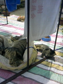 今日も良いお天気でした(σ`・∀・)σйё! 似たような色(柄は違うが)の りき と まろん が仲良く昼寝(∩.∩) トキたま、交互にヒゲや足が「ぴくっ!ぴくっ!」っと痙攣っぽい反応が面白い。 何を夢見てんのかな~?(゚c_,゚`。)