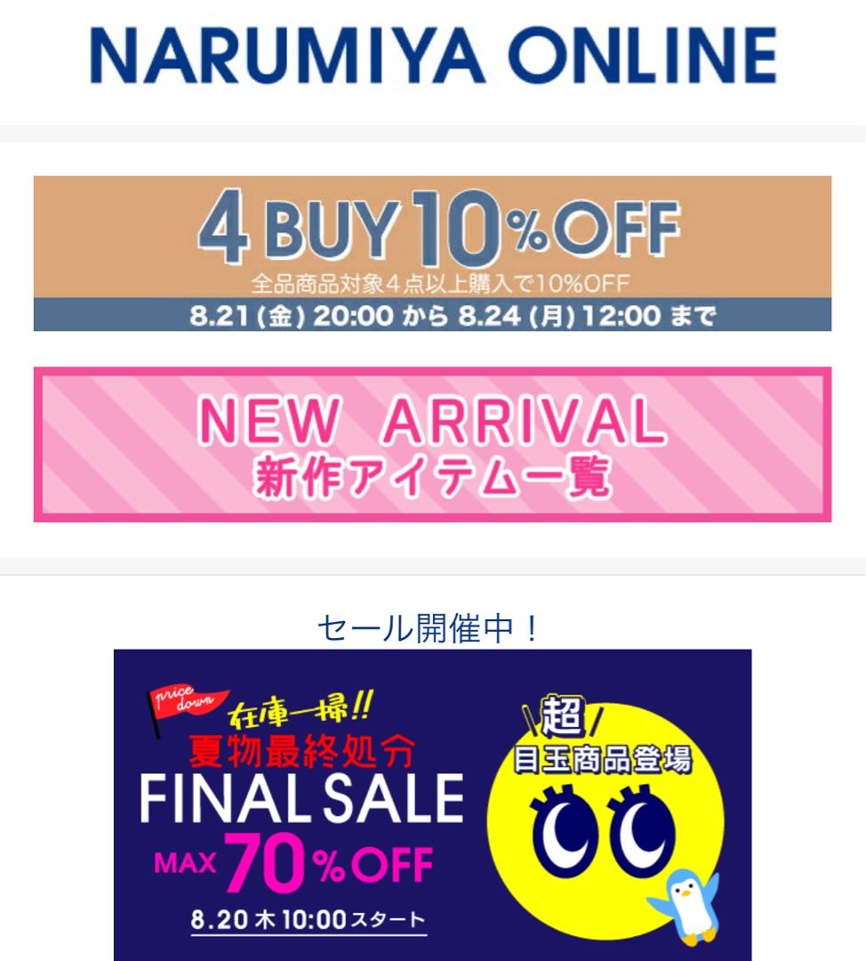 10%オフクーポンの謎に気がつきました。 ナルミヤファイナルセールのことばかりですいません💦 もう買いたいものはすべて買ったのに まだHPを徘徊中… そしてクーポンの謎に気がつきました💦 商品をみているとクーポンが画面の右下にでてくるのですが、 そちらには「3個以上ご購入の場合」 とでてきます。 3個以上???? トップページには 4buy 10% とあるのに💦 実際買い物カゴにいれると… 3点でも10%オフクーポン適応されます!! 買いたいものが3点しかない方 わざわざもう1点買わなくてもよさそうですよー。 買いたいものが1〜2点しかない方は100円台の靴下とか小物を同梱するのもいいかも。 ラブトキシック(Lovetoxic)モチーフ刺しゅうパイルソックス ラブトキシック(Lovetoxic)裏パイル くるぶしリブソックス ラブトキシック(Lovetoxic)リングヘアアクセサリー ラブトキシック(Lovetoxic)チェリークマ2B鉛筆 メゾピアノ 、在庫減ってきてますね。 メゾピアノ(mezzo piano)バレエモチーフバックチュールドッキングTシャツ 70% 3201円 メゾピアノ(mezzo piano)ボーダーTシャツドッキングリボンワンピース 70% 2900円 メゾピアノ(mezzo piano)レース切り替えストライプ丸衿ワンピース 70% 4800円 メゾピアノ(mezzo piano)ギンガムリボン袖レースTシャツ 71% 2200円 メゾピアノ(mezzo piano)リボンロゴ衿レースTシャツ 2277円