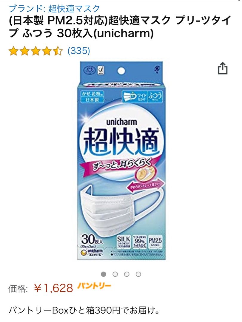 楽外ですが amaz⚫︎nパントリーで超快適マスク30枚入り入荷してます! 1枚54円 送料390円だけど 対象商品のレトルトカレーなど10点同梱して 500円引にしました。 ケンコーコムさんにも入荷したみたいだけど、アフィは出たけど売り切れ。 気づくのが少し遅かった… ↓ 超快適マスク プリーツタイプ ふつうサイズ(10枚*3袋入*2コセット)【超快適マスク】[花粉対策 風邪対策 予防] 3126円 ユニ・チャーム 超快適 マスク PM2.5 プリーツタイプ ふつう 7枚 ユニ・チャーム 超快適 マスク PM2.5 プリーツタイプ ふつう 7枚 ユニ・チャーム【メール便発送】4903111950232 このあたり再入荷してくれないかなぁ… エナジードラッグ→★ 30枚 1095円 IKOI→★ 30枚 1047円 サンドラッグ→★ 50枚 1680円 姫路流通→★ 50枚 1680円 送料無料