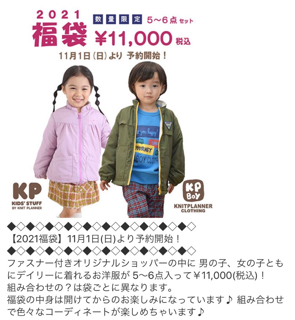 皆さんどうされますか? 今回のKP福袋。 11/1より予約開始だそうです。 (KPからのメールより) “ファスナー付きオリジナルショッパーの中に 男の子、女の子ともにデイリーに着れるお洋服が 5~6点入って¥11,000(税込)! 組み合わせの?は袋ごとに異なります” 今回の福袋は 組み合わせは袋ごとに異なる… 今年は本当の意味の「福袋」なんですね。 モデルちゃんたちが履いてるスカートとパンツは…新作?福袋用の商品なのかなぁ。 (KP 公式HPより) 詳細はこちら→★ KP ケーピー 子供服 福袋 2020 【送料込】90cm【男の子】【女の子】KP/KP BOYお買い得HAPPY BAG 【楽ギフ_包装】【楽ギフ_包装選択】KP ニットプランナー KP ケーピー 子供服 福袋 2020 【送料込】100cm/110cm/120cm/130cm/140cm/150cm【男の子】【女の子】KP/KP BOYお買い得HAPPY BAG 【楽ギフ_包装】【楽ギフ_包装選択】KP ニットプランナー KP/ニットプランナー★2020年福袋★女児/男児11,880円【90c/100c/110c/120c/130c/140c/150cm】【税込/送料込】北海道・沖縄は追加500円