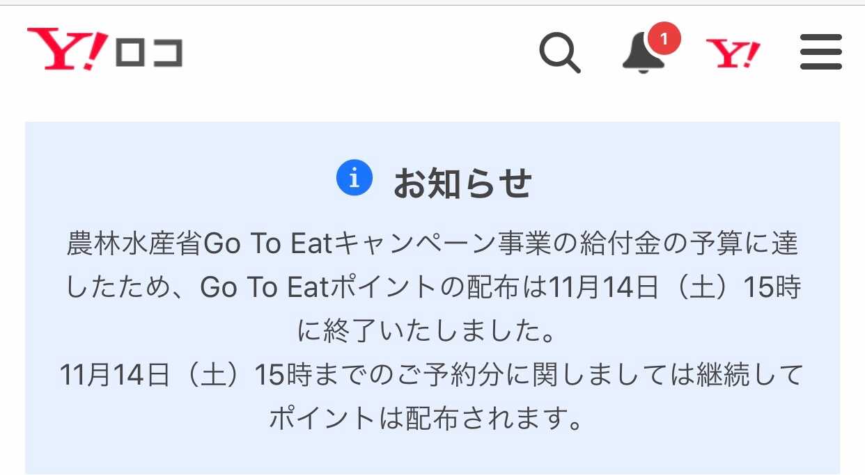 GO TO EATのポイント付与がぞくぞくと終了してます💦 Yahooロコとぐるなびはすでに終了( ; ; ) 食べログとホットペッパーはまだ予約できそうですが、いつ終了してもおかしくない状態。 今なら間に合うかも!? やはりお得すぎでしたよね。 ※11/15追記 ホットペッパーも1/15 午前2時に終了💦 ※11/16追記 食べログも11/15 21:40に終了。