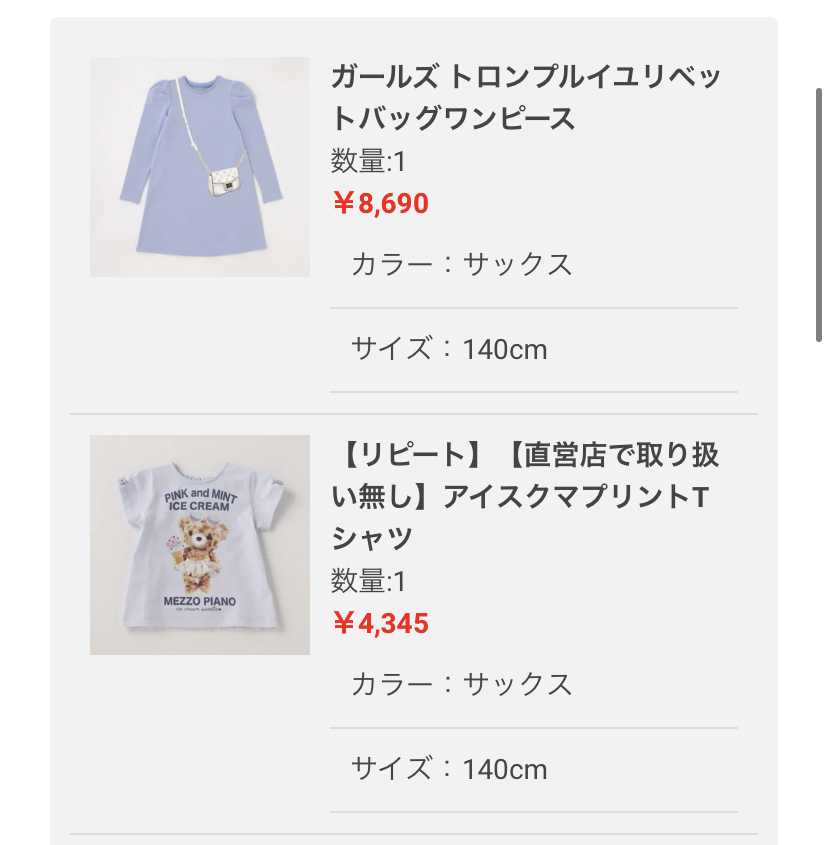 2回クーポン使えました。結局、追加ポチ。50%オフ…私の中では割引率やや渋いんだけど…140cmとなるとなかなかセールに残らないから…お会計が2回にわかれたら、クーポンまた使えました!本店さんでは1万円以上で送料無料キャンペーン中だけど、せこい私は、店舗受け取りにして、お会計を3回に分ければ、クーポン3回使えたなーなんて思ってしまうが😅でも取りに行くのも手間だしね😅1.ガールズ トロンプルイユリベットバッグワンピース (140cmサックス) 価格:¥8,690 x 数量:1 = 合計:¥8,6902.【リピート】【直営店で取り扱い無し】アイスクマプリントTシャツ (140cmサックス) 価格:¥4,345 x 数量:1 = 合計:¥4,345メゾピアノ(mezzo piano)アイシーソーダポップ柄 カットワンピースメゾピアノ(mezzo piano)パステルフェザー柄セパレート ワンピース水着【SWIM】
