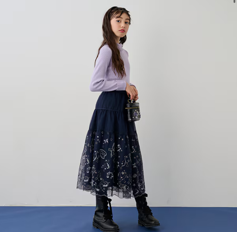 (写真はNARUMIYA公式HPより)アウトレットで70%オフ❤️さらに複数割で20%オフで、76%オフ❤️❤️★ANNA SUI miniティアードチュール星座ロングスカートL(130-140cm) 紺17380円→70% 5214円→4171円メゾピアノジュニア(mezzo piano junior)リボンベルトフリルチュールスカート