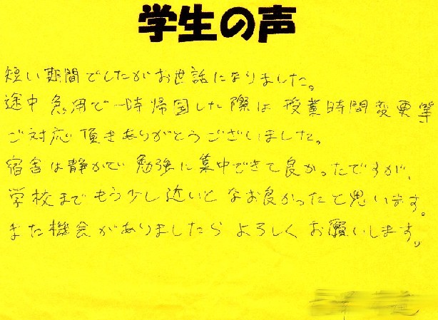 当時は男性の宿泊設備と学校が遠く、ご不便をおかけしました。現在は男性も学校近くにご宿泊いただけます。