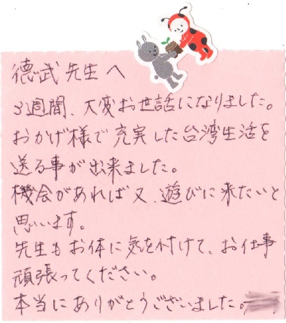 ・日本人教師/日本語可の台湾人教師による英語指導可/ ・日本人教師/日本語可の台湾人教師による中国語・台湾語指導可/ ・日英中 翻訳・通訳を承ります/ ・日系企業でのマナー研修(電話応対/名刺交換/報連相/クレーム対応 等)