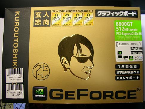 年越しは神社でカウントダウンなぞしてました。友人に引っ張られて行ったんですが、正直家でゴロゴロしてたかったです。で。あけましておめでとうございます。今年もよろしくお願いします。1月1日ということで、閉まってる店も多いんですが、家の近くのOAナガシマというPCショップは元旦も比較的早くから遅くまで普通に営業しているようでしたので、特価品目当てに少々行ってまいりました。目に付いたのと言えば、・ZALMAN VF900CU \3.000・SAPPHIRE RADEON HD3850 \20.000・GIGABYTE GA-P35-DS3R \10.000などでしょうか。HD3850がちょっと欲しかったです。まぁ自分はこれらの特価品を選ばずに、巷で大人気の8800GTを買ってまいりました。上が7900GSで、下が8800GTなんですがでかい。SOLOに収まるギリギリという話は聞いていましたが、でかいです。HDDを移動させて、やっとで収まったんですが、空気の流れを遮断してそうです。で、軽く起動させてみたんですが。熱い。リファレンスファンがクソという話は聞いていましたが、熱いですね。アイドル57度、ロード74度です。それでも、ゲーム中やベンチで負荷で90度を超えるという話を聞いていたので、それほど熱くないような…?リファレンスファンも少々マイナーチェンジが行われたんでしょうか。いずれにせよ、ファンを変えたほうがよさそうですが、最近はVGAクーラーも増えて着ているので迷いますね…。最近人気がでてきた、DuOrb(通称:おっぱい)やペルチェ素子を使ったKRVC-MA8200なんかが気になります。VF1000-Cu-LEDもゴツくていい感じですね。ちょっと面白いクーラーが欲しいです。