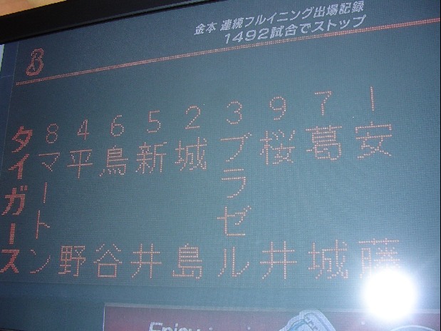 うわ!今から始る横浜戦のスターティングメンバー発表を見てたら、いつもの「4番レフト金本」がなく、5番でもなく・・・8番でもなかった・・・今日、1492試合目で連続フルイニング出場記録がストップしてしまった・・とうとう、この日が来てしまったか~でも、この日まで無理してよく頑張ったと思う。よくやった!兄貴!!