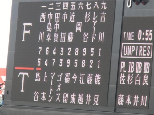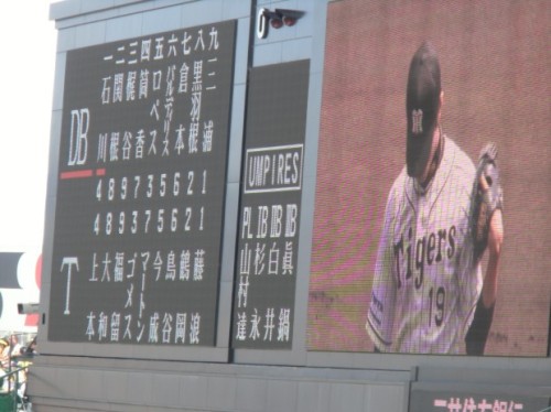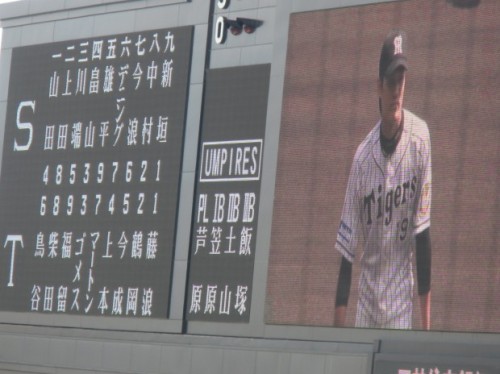 昨日、大谷投手を相手に1-0の接戦で勝利し、今日はその勢いで連勝したいところ先発は能見投手、日本ハムは吉川投手。<スターティングメンバー>1回裏2アウトからマートンがヒットで出塁後、不調のゴメスが右中間へのタイムリーツーベースで1点先制<ゴメスコール>能見投手は2回にソロホームランを打たれ、それほど調子は良くないが6回を5安打1失点に抑え試合をつくりました。<ピッチャー能見、バッター中田>打線は、5回にマートンのタイムリー6回に代打狩野のタイムリー7回はまたまたマートンのタイムリーが出て4-1で3点リード<今年絶不調のマートン選手が復活の猛打賞>7回は安藤投手、8回は高宮投手、9回は呉昇桓が見事0点に抑え勝ったーヒーローインタビューは猛打賞2打点のマートンと代打でタイムリー狩野選手能見投手はこれで4勝目(6敗)呉昇桓は17セーブ目タイガースは4連勝で4月5日以来の貯金交流戦は8勝3敗で2位頑張ってー!!【過去の観戦記】←2002年からの観戦記の一覧です