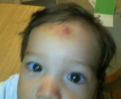 次男が歩くようになって3ヶ月。そろそろ走りたいみたいしかしまだ1才と3週間。気持ちばかりが先走り足はまだまだついてこない。そしてとうとうやってもうた。私はたまたま横から全部見ていたが歩いて走って転んでおでこからダイブさらに前に10cm程おでこで地面を横滑りとダイナミックにおでこからダイブしたのでこ~んな事にでも小さい頃から顔から足まで縫い傷だらけの私の子だからまだこれからのはずねっ