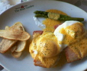 台風が来ていたり、父親が来ていたり、長男が風邪をひいたり、次男が手足口病になったり、、、と言い訳はこの辺にして、ブログ更新がしばらく途絶えておしました先週末 久しぶりに北中城にある「ローズガーデン」というレストランに朝食を食べに行きました。まだボブとデートをしていた3年程前からたまに行くレストランです。イタリア料理と言っていますが、イタリアメリカ料理??アメリカ風イタリアン??という感じでお客さんもほとんどアメリカ人。量もアメリカサイズ!!(しかし妊婦の時はペロッとあの量を食べていたからすごいよなー。。。。)以前は「イタリアンオムレツ」が大好きで、いつも頼んでいたのですが 最近はエッグベネディクトを夫婦で頼みますこれが美味しい!イングリッシュマフィンの上に分厚くスライスされたベーコンとポーチドエッグがのってオランデーズソース(ボブの説ではこんな名前のソースらしい)がかかってるんだけど~しかしあのソースはどうやって作ってるのかな??そしてイングリッシュマフィンを使ってるけどヨーロッパ方面から来てるのかな??と、エッグベネディクトに対する疑問が沸き始めたので調べて見ると・・・・どうやらNYに住むベネディクトさんが、奥さんだか酔っ払いだかのわがままに対して たまたまあったイングリッシュマフィンとカナディアンベーコンと卵とオランデーズソース(ボブすごい!!)を使って作ったのがこの料理の始まりだという説があるみたい。「へーぇ!へーぇ!へーぇ!・・・・・・・へーぇ!!」かなり疑問が沸いてた割には適当なリサーチで。。。内地でもちょっとしたホテルの朝食にはあるみたいだけどもっと普及してもいいよなぁー!いや・・・してくれ!!というくらい美味しいよー、エッグベネディクト。しかし濃厚だから 毎朝という気にはならないけど たまにむしょうに食べたくなるんだなー。