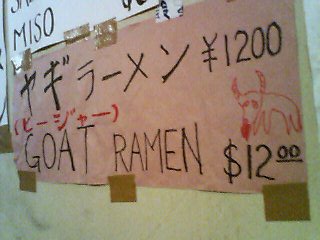 行ってきました 噂の『ヤギラーメン』山羊好き&げてもの好きの自分でもなかなか想像することすら難しかったこのラーメンを体験してきましたよー感想を先に述べますと『意外にあっさり』『意表をついて美味しい』です。山羊汁より臭くなくて、ふーちばーは山羊らしくてんこ盛りで匂いはやっぱりするんだけれど なんというかあっさりしてる!山羊汁はスープに山羊を入れただけなのですが、これはちゃんとラーメンのスープとMIXしてあるとのこと。お店もここの店長のようにガラッパチ??なかんじなんで、友達の知り合いの店じゃなかったら入るのに結構勇気がいるかも。。。その上『ヤギラーメン』を頼むなんてそりゃあ 相当の覚悟が、、、、といった感じでしたら しかしそれが意外に山羊いまいちの人にもOKそうな感じで美味しかったんだなぁ山羊好きの人がいるなら是非一度お試しあれ!!ですね場所の掲載の仕方がいまいち分からないので調べて後日お知らせします。すみません。。。