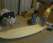 今ではすっかりボディーボーダーになり、毎回海に行ってはスピンに悪戦苦闘している私ですが、実はショートボードから始めたなんちゃってサーファーでもありましたショートでは『波待ち専門』でいつも集団の隅っこのほうで偉そうに板に座りながら、波だけ待ち続けておりました。それからしばらくして 内地の友人からロングを譲り受け、挑戦。その時は海友達もいなくて 無謀な私は沖でパドルを始めるための方向変換を板を水に平行にしたまま、、、つまり半径2M程『おらっ!!どかんかい!!』と他のサーファーを板で振り飛ばすかのような事を水の中でしていたのです今考えたらよく他のサーファーに海に沈められなかったなーと思います今はプロのボディーボーダーの先生について しっかりルールから教わりやっとこスピンまでたどり着き、海友達も出来て快適な波乗り生活を送っていますそんな波乗り生活を送るきっかけとなった、そして今ではお部屋のインテリアと化しているショートボードもこうやって子育てに協力してくれています身近に海を感じながら遊んで、将来はサーファーかもと勝手な期待をして、でもあんまり儲からないしなーってこれまたもっと勝手な事を考えたりしています