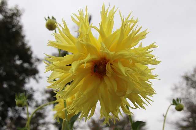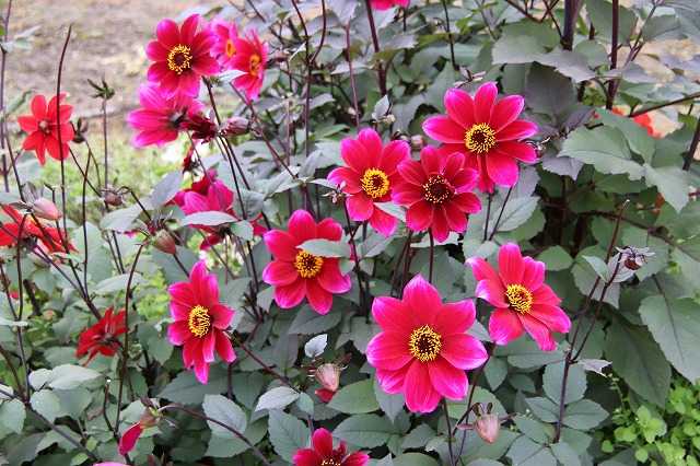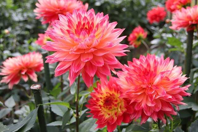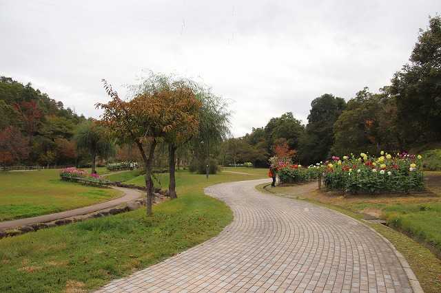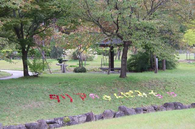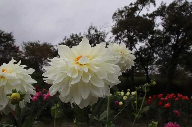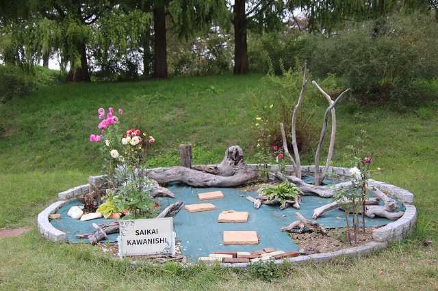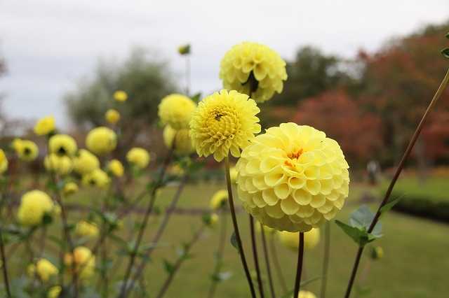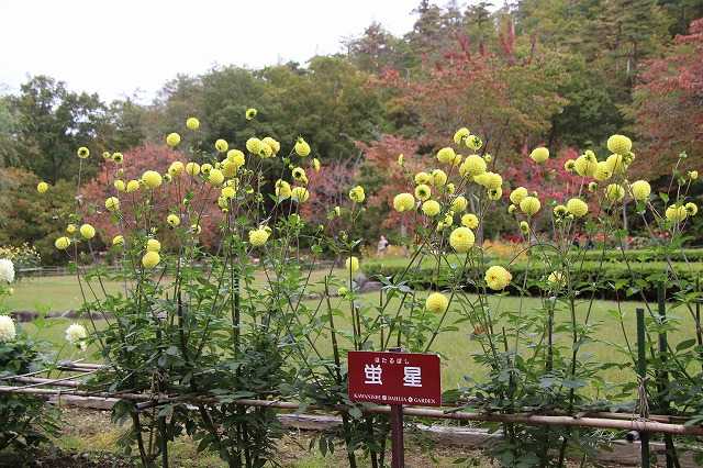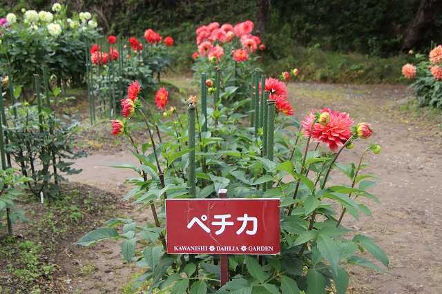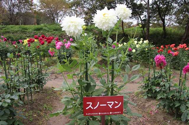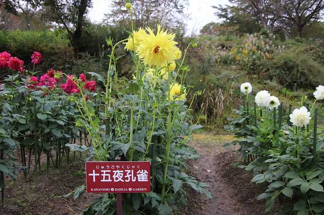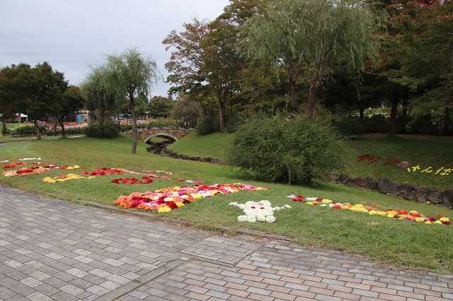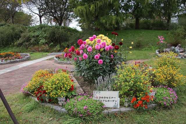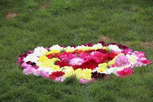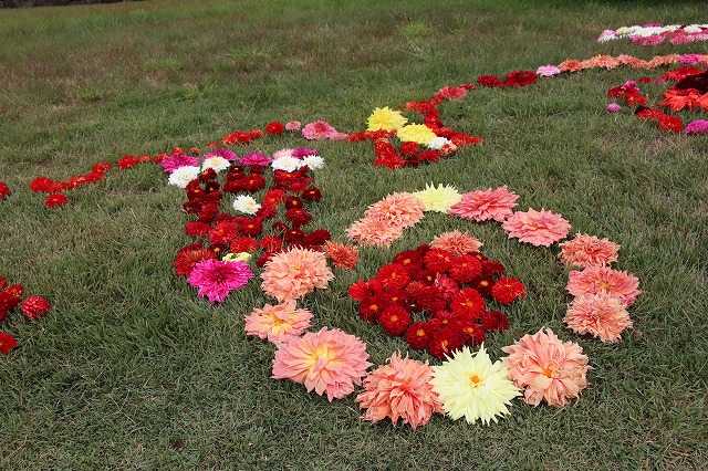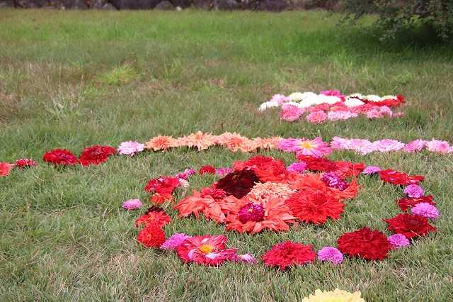 小松保育所の園児たちが、小松花屋さんの指導の下、芝生の上にダリアの花を