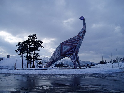 勝山恐竜博物館の勝山市は岐阜県側にあります勝山に恐竜化石がでて此処に博物館を建てました勝山恐竜博物館近くにスキージャム勝山等のスキー場があります連なる山並みに雪が積もっていました帰り、越前竹人形の里へ行きました