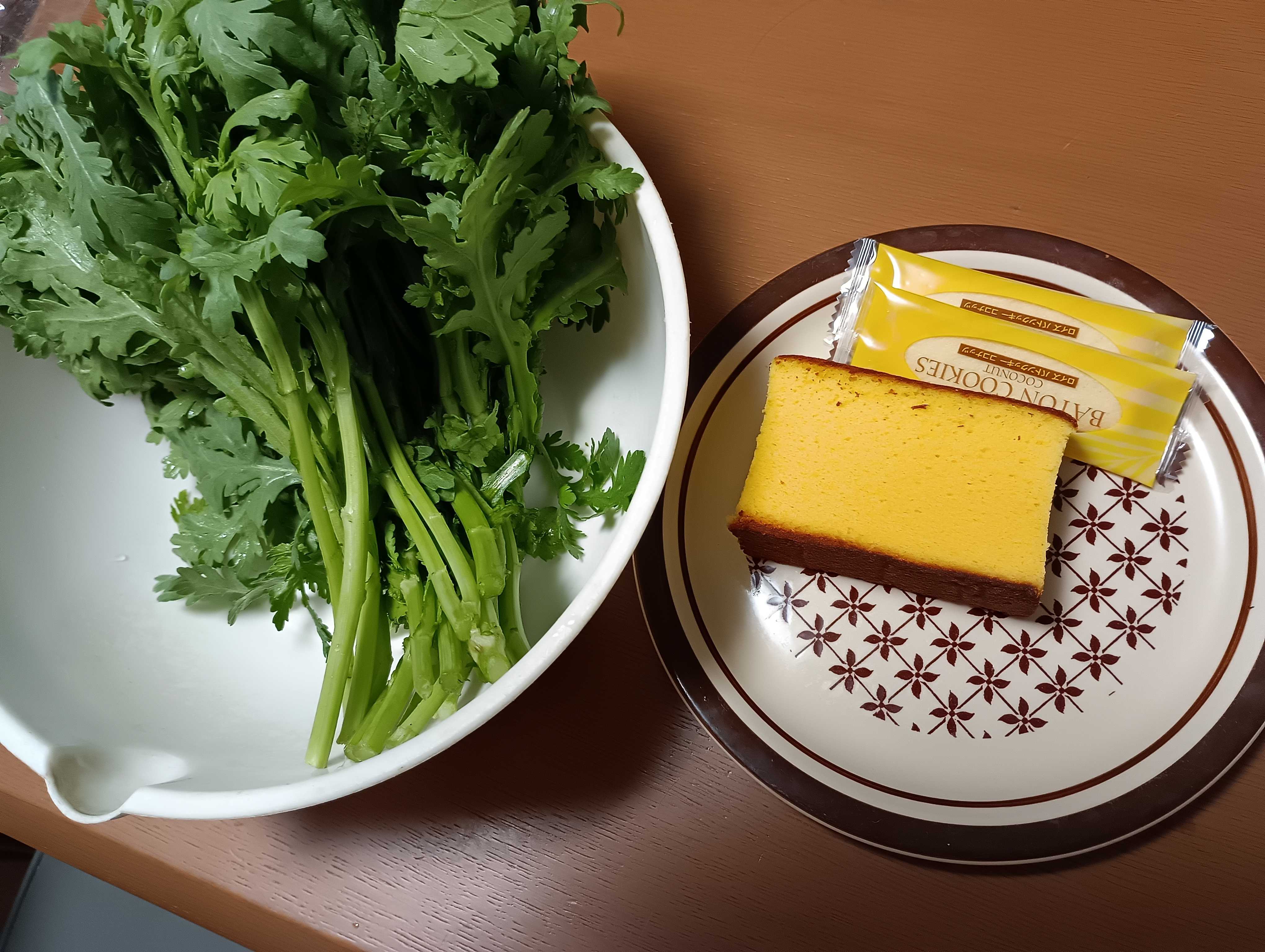 昨日の体育館で頂いたお八つと春菊です 春菊の種蒔きしましたが