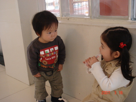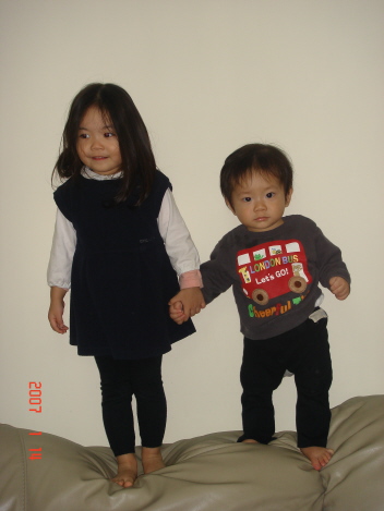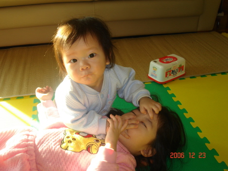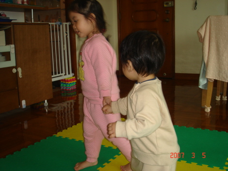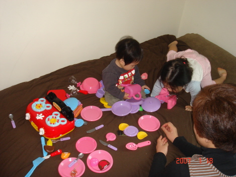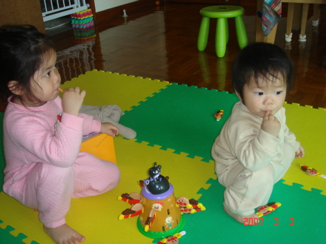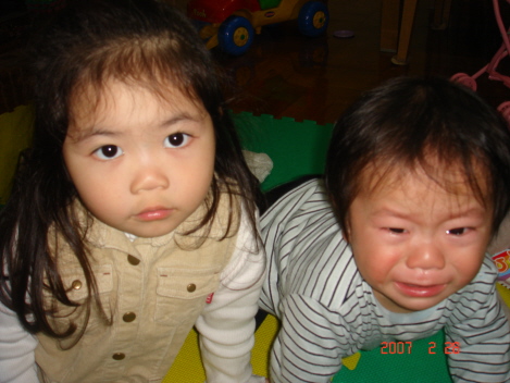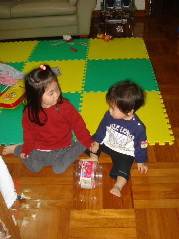 ヒヨが3歳になる3日前ぐらいに、ケイに意地悪をしている彼女に対し「一体いつになったらケイ君に優しく出来るのよっ!!」と怒鳴ったことがありました。その時ヒヨは、冷静に「3歳になったら。」と答えていました。そして、先週3歳になったヒヨはというと。。。100%とまではいかないものの、本当に確実にケイに対して優しくなっています。有言実行タイプ...かなぁ声を出しながら、手で口を叩いて「あわあわあわ~」ってやるのがお気に入りらしいケイ。でも、グーにしたおてては、どうしてもほっぺ止まり本人は得意顔なんですけどね~。