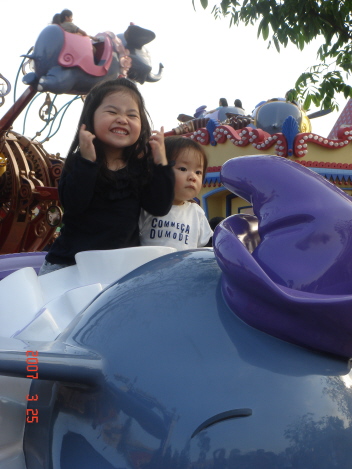 家でのんびり過ごす予定だった日曜日。 朝ごはんを食べながら、ふとディズニーランド行きを思い立ちました。 ここのところずっと雨という予報でしたが、幸い曇っているだけでそれほど悪天候というわけでもなし。。。 もしかすると、今日は大穴(空いている日)かもしれない!ということで、行ってきましたディズニーランド。 お昼頃タクシーで行ったのですが、予想通り!今回は今までで一番空いていました。 殆ど並ばなくてよかったので、ラッキー!お陰で、のんびりと廻った割には、色々アトラクションを楽しむことが出来ました☆ プーさんのハニーポットにも乗ったしアリスのティーカップにも乗りましたパパはちょっと酔っていたけどキャラクターとの写真も子供達だけで立たせて撮ることが出来るようになりました。3Dのアトラクションも、十分楽しめるよパパの肩車でパレード見物。花より団子派のケイ。と~っても楽しかったね♪また来ようね