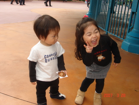 今日は創立記念日ということで、ヒヨの幼稚園はお休みでした。というわけで、またまたディズニーランド前回、ドナルドとデイジーで大泣きしたケイ。今回はどうだろう???ということで、まずは一番親しみやすそうなプーさんの所へ。そんなわけで、ケイはプーさんで早くも挫折。ヒヨは大好きなキャラクター達と写真が撮れておおはしゃぎお昼は、ディズニーランド内の中華レストランへ。ケイはモリモリモリモリ食べていました2コ目のカスタード饅頭を手に、ほくそえむケイ。なんて幸せそうな顔。。。明日は幼稚園なので、今日は2時半までで切り上げました。タクシーの中では、2人ともグッスリまた行こうね~