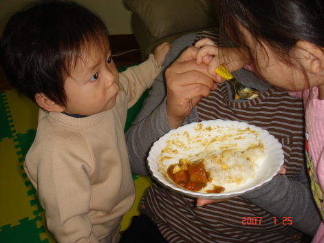 お正月のお節に続いたケイのお誕生日料理。何となく胃袋がカレーを求めている感じだったので、今日はヒヨも大好きなカレーにしました。今夜はカレーだと分かっていたので、お昼ご飯の時にも「カレー!カレー!カレー!」としつこかったですそんなヒヨ。今日はお昼寝抜きでハッスルしていたので、夕方5時ごろから限界の兆しが見えていました。そこで、ヒヨだけ6時前に夕飯。ばぁばに食べさせてもらっていたのですが、我が家の食いしん坊大将ケイがすかさずやってきて、ばぁばの腕...というかヒヨのスプーンにまとわりついていましたねぇ、それ僕のご飯???僕、食べちゃうよ?ね、ねえちゃん、それ僕の。。。さすがにケイは、まだ大人と同じカレーなんて食べさせられません。いつもはケイの分だけ肉じゃが風にするのですが、今回は「たまには洋風に♪」と思って味付けを変えました。「何味」ってはっきり言えない、ちょっと不気味な味になったのですが...ケイはバクバク食べてくれました。眠いながらも、カレーをしっかり完食したヒヨは、歯を磨いた直後の6時40分にソファーの上で熟睡してしまいました