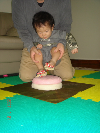 ケイの誕生日は2月5日。ちょっと早めですが、今日、ケイのお誕生会をしました。この日の為に日本から駆けつけてくれたWばぁばにもお祝いしてもらって、ケイはとっても嬉しそうでした♪餅踏みも嫌がらずに出来ました足が大きくて、草鞋がちゃんと履けないヒヨも、ケイが餅踏みするのをとっても楽しみにしていました算盤代わりの電卓と、定規、お金、ペン。ケイが最初に握ったのは....定規でした1歳のお誕生日の記念にファーストシューズとわらじお祝いの膳は、卓袱風にしてみました。ケイの祝い膳ヒヨは今日、何度もケイに「ハッピバースデイ♪」を歌ってあげていましたケイも自分が主役なのが分かっているようで、とっても嬉しそう♪一昨日から、突然一人で立てるようになったケイ。一日一日、立っていられる時間が長くなっています。