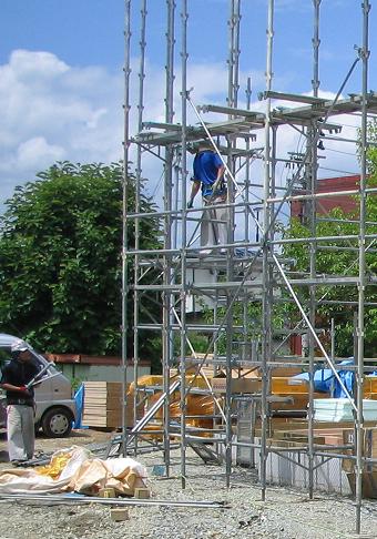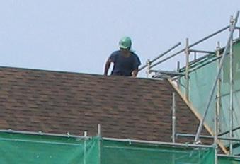 上からは太陽、下からは照り返し・・。●顧問会員のTさん(30代) (相談:生活設計・マイホーム建築)T家のマイホーム建築、順調・・です。屋根工事中。 メチャクチャ暑い!・・はずです。今日のT家マイホーム工事。左側から長いハシゴで資材を上げているようです。足場の覆いで、状況がよく見えません。 (^^ゞ Tさんのマイホーム:進行状況 1 家計の現状診断・問題点把握 2 ライフプランニング(生活設計) 3 資金・ローンの目安を立てる 4 土地探し・土地売買契約 ← 3/27 契約。 5 展示場ほか見学 6 事前手続き・住宅プラン検討・作成 7 住宅会社・数社が提案競争 ← 5/14。 8 業者決定・請負契約・事前手続き ← 5/29 契約。 9 着工~上棟 ← 6/19 地鎮祭。 10 完成・入居 ← 10月の予定。 11 住宅ローン返済開始これは生活設計の実録日記です。・目的は「消費者の目を覚ますこと」 です。 (家計放置中の消費者の)・立場は「中立・公正」ではありません。 (極端に消費者側に片寄る)《 顧問会員希望の方へ 》 「顧問会員って何?」で支援内容や当事務所との関係を確認の上、どうぞ。⇒fpst@axel.ocn.ne.jp