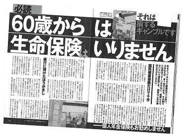 医療保険同様、生命保険も いらない。連載・・3日目です。週刊雑誌が生命保険を取り上げて記事にしていたので、掲載します。・・私のコメントを添えて。週刊現代 の9/18号・・です。 ※は、私の声。『60才すぎたら生命保険は いらない。』・・その3生命保険はどうか? 60才から生命保険(死亡保険金3000万円、10年定期)に加入した場合の保険料などを示したのが下表になる。どの保険に加入しても 保険料が10年間で400万円以上もかかることがわかる。そのため、医療保険同様に「生命保険も60才からは いらない」というのが保険のプロたちのセオリーになっているようだ。 ※当たり前・・です。「サラリーマンの場合、世帯主が亡くなれば給料がゼロになってしまい、家族が路頭に迷う可能性がある。 だから数千万円の生命保険に加入した方がいい。 ※・・とは限らない。 幼児がいても死亡保障が不要な人、 当事務所の顧問会員で・・ いくらでもいます。 個々の検証が必要です。一方で60才を越えると、ほとんどの場合、子どもは独立しているため、遺族に莫大なおカネを残す必要はない。そもそも年金収入に加えて、退職金を含めて預貯金が1000万円もあれば妻一人が老後を暮らすのに不足しないし、代わりに高額な保険料を払うことで大切な蓄えを削っていくのは得策ではないのです。」(家計の見直し相談センター代表の藤川太氏) ※当たり前・・です。サラリーマン時代に加入していた生命保険が更新時期をむかえる60才前後に、「解約するか」「継続するか」「転換するか」の選択を迫られるケースも多い。現役時代に定期保険(2500万円、掛け捨て)、貯蓄性のある終身保険(500万円、60才払込終了)、これに日額1万円の医療特約(掛け捨て)を付けて保険料月額3万円という、最もよくあるケースについて正しい「対処法」を考えてみよう。専門家はまず第一に、「同じ契約をそのまま更新するのはやめた方がいい」という。 ※当たり前・・です。 「生命保険はすべて清算できないか?」 ・・という基本スタンスを持ちたい。 『生命保険加入=お金を捨てること』 ・・を、しっかり認識したい。「この契約をそのまま更新した場合、保険料が6万円くらいに跳ね上がることがある。保険の営業マンから『お葬式代の備えに』などという勧誘を受けて更新する人も多いが、そもそも現役時代と同じ死亡保障額は必要ない。子どもがまだ成人していないようなケースを除けば定期部分は解約すべきでしょう。低額の年金しか受給できない、妻が若いので不安だという人は、保障額を半分に減らすことで、保険料を上げない契約にしてもよい。ただその場合も、定期保険は最終的に更新できなくなる年齢があること、再び更新時期が来て保険料がさらに上がる可能性があることに気をつけたい。」(ファイナンシャル・マネジメント代表の山本俊成)一方で、貯蓄性のある終身保険については「解約」「転換」すると損するケースがあるという。前出・藤川氏が解説する。「生保会社はあらかじめ『予定利率』を決めて、それをもとに保険料を算出します。10年以上前に契約した終身保険は予定利率が高いため、保険料が割安になっている。また解約した際には『解約返戻金』がもらえるが、保険料を払い込んだ後も持ち続ければこの額は年々増えていく。このケースでは終身で死亡保障500万円が残る上、いつでも解約して引き出せる貯金代わりになるのです。」特に’89年4月1日以前の契約日であれば予定利率は5.5%、’94年(以下同)だと4.75%、’96年(以下同)なら3.75%’99年(以下同)は2.75% と高い。これらの時期に加入したものは、「お宝保険」と呼ばれ、解約してはいけないものとされる。 ※とは言っても・・ 不要な「保障」にまでお金を払う必要はない。 お金のたれ流しであることには変わりがない。 不要な「保障」と気付いた時点で即解約!「お宝保険を保有されると保険会社にとっては損がふくらむことになる。他の保険に転換させようと営業セールスをかけることが多いが、口車に乗ってはいけません。」それは『高い利率の定期預金から、より低い利率の定期預金に乗り換えませんか』と言われているのと同じだと気付いて欲しい。」(紀平正幸氏) ※その通りです。 定期預金での説明なら理解できるけど、 保険になるととたんに意味不明!・・に。 だます方は・・「オヌシも悪よの~。」 だまされる方は・・ただのおバカさん。(失礼!)ちなみに、払い込みの満期が65才や70才のものもある。これもお宝保険なら解約は避けたいところだが、虎の子の年金収入から保険料を払いたくないという人には、「払い済み」で対処する手もある。「払い済み保険とは、その段階で保険料の支払いをストップし、その時点で貯まっている解約返戻金を使って一時払いの終身保険を購入するというものです。例えばこれまで500万円の終身保険に加入していて解約返戻金が300万円程度貯まっている場合、それで450万円程度保障の終身保険を買える。予定利率はこ