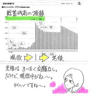 ほぼ平らなキャッシュフローグラフ。初めてお目にかかる、珍しいグラフです。〇顧問会員のHさん(40代) (相談:ライフプランニング)今日・・午後、ご夫婦で来所。家計の『現状診断』結果の説明・・です。生涯のキャッシュフローから・・生活設計上の問題点はありません。・・が、生命保険では・・やはり、お金をたれ流しています。もうしわけありません。詳しい記事を書く時間がありません。明日・・改めて書きます。あ・・それから、電話で報告がありました。顧問会員のMさん(30代)「今日、市から電話がありました。 そのままでOKという返事でした。」武田FP「うわ・・、良かった・・ですね~。」Mさん「おかげさまでした。ありがとうございました。」「さあ!これから建築!」・・と手続きに入ろうとした時に「道路に問題がある」・・と、市からイチャモンを付けられました。そこで・・9/9、M家父子に私が同行して市へ殴りこみをかけてきました。 (^^ゞ( 9/9の記事参照 )その結果の返事が市から来て、OK・・だったということです。これで、普通に手続きをして、マイホームの建築に着手できます。よかった、よかった。今日の佐々木FP〇メール顧問会員のKさん(30代) (相談:ライフプランニング)現状診断資料の作成。作業着手2日目・・です。〇「行列のできるFP事務所」 資料作成の順番待ちの行列。 お待たせして、大変ご迷惑をおかけしています。 本当に申しわけありません!1 Mさん(40代):現状診断 ← 回答待ち。2 Mさん(40代):現状診断 ← 回答待ち。 (7/20到着)3 Kさん(30代):現状診断 ← 今日の作業。 (7/21到着)4 Yさん(20代):現状診断 ← 7/29 シート到着。5 Mさん(40代):シミュレーション ← 8/11 依頼到着。6 Sさん(30代):シミュレーション ← 8/26 依頼到着。7 Mさん(30代):現状診断 ← 8/27 シート到着。8 Fさん(50代):シミュレーション ← 9/6 依頼到着。「現状診断」 : 新規顧問会員のため、まず作成する資料。「シミュレーション」 : 顧問会員の要望で作成する資料。これは生活設計の実録日記です。・目的は「消費者の目を覚ますこと」 です。 (家計放置中の消費者の)・立場は「中立・公正」ではありません。 (極端に消費者側に片寄る)《 顧問会員希望の方へ 》 「顧問会員って何?」で支援内容や当事務所との関係を確認の上、どうぞ。⇒fpst@axel.ocn.ne.jp