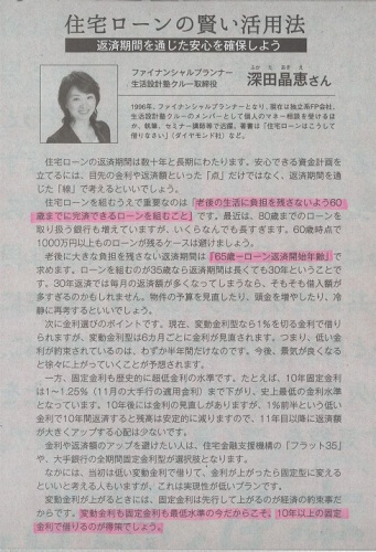 老後に大きな負担を残さない返済期間は、「65歳-ローン返済開始年齢」 ?自分の頭で考える生活設計。新聞より・・気になった記事があったので、取り上げてコメントします。11/13(木)日経新聞 『住まいづくり&土地活用特集』 (全面広告)『住宅ローンの賢い活用法』「返済期間を通じた安心を確保しよう」 紙面の下半分には・・ 大和ハウスや積水ハウスの大きな広告が・・。 (新聞社にとっては大きな収入源・お得意様) もちろん・・いつも言っている通り、 このような大手メーカーで 建築してはいけない。 ・大勢の営業マン等の、建築工事に 直接関わらない人達の人件費。 ・膨大な宣伝広告費。 ・常設の大型展示場の運営費。 余計な経費を負担することになるので、 意味も無く高い建築費になる。 (当たり前)「老後の生活に負担を残さないよう 60歳までに完済できるローンを組むこと」・・と言っています。「65歳-ローン返済開始年齢」のように、返済期間を定めればいい・・と言っています。そのようにするのが、本当にいいでしょうか?私がいつも言っているのは、『住宅ローンは長く借りて短く返そう。』・・です。単に返済期間に注目するのではなく、毎月の返済額をしっかり押さえたい。大部分の人にとっては、多額の住宅ローンを借りて返済している時期が、人生最大のリスクを背負っている状態です。生活設計的には、住宅ローンを返済しながら・・なお、一定の貯蓄ができる状況作りが望ましいです。当初の返済期間を60歳や65歳で終わるような設定を無理に行なうと、毎月の返済額が大変な負担になって、長期間・・リスクに晒されることになります。当初設定では、ローン完済時期は70歳でも75歳でも構いません。返済期間が長いほど、返済額は少なくなります。(当たり前)当初計画で重視するのは、「完済時期」ではなく 『返済額』にしたい。住宅ローンを返済しながら貯蓄ができる、そんなレベルの返済額に設定すれば、将来・・不測の事態が発生しても対応しやすいし、(リスク管理・リスク低減)貯蓄ができるということは、積極的な繰上返済が可能になる・・ということでもあるので、 ※繰上返済で利息節約効果は 当たり前に大きいが、 期間短縮効果は意外に大きく、 だれでも驚くことになる。返済期間をどんどん短縮できて、定年退職前に完済!・・ということができてしまいます。フルタイムの共稼ぎにの場合などは、定年退職前・・どころか、借入れ時点から7~8年で全額完済!・・などということが、普通にできています。(当事務所顧問会員の複数事例)リスクを最小限にしながら、できるだけ早めに完済してしまおう!それから・・「変動金利も固定金利も最低水準の 今だからこそ、10年以上の 固定金利で借りるのが得策でしょう。」・・と言っています。ちょっと前までは、私も同様に言っていました。・・が、最近の顧問会員を見ていると、この話は人による・・なあと思っています。キャッシュフローが豊富でない人は、上記の通り・・堅実に行くということでいいんですが、年収がすごく多い人とか、フルタイムの共稼ぎとかで、がんがん貯蓄ができてダイナミックに繰上返済ができるなら、変動金利もあり ・・と、このごろは思っています。このレベルの人たちは、30年返済の住宅ローンを7~8年で完済することが可能です。なので、変動もあり・・です。数年後に金利が上昇したとしても、(私はその可能性は無いと思うが)残債金額が小さくなっていますから、たいした被害はこうむりません。家計改善したい?きちんと生活設計したい?なら・・方法は、1 支出を減らす。2 収入を増やす。これだけだ。 他には無い。 (各種業界にだまされないように)支出を減らすなら・・(できるだけ)1 生命保険に加入しない。2 借金をしない。3 経費を払わない。これだけでいい。すごく かんたん。 見違える人生になる。『うまい話は無い』『「常識」は業界が作っている』『専門家の足し算で、 人生設計はできない。』返済額で押さえる! ・・か。 《 生活設計セミナー 》 2時間3万円(+消費税・交通費)。 銀行・証券・保険・住宅会社等にだまされない生活設計。 消費者側に片寄った内容の講演。 講師をお受けします。《 質問希望? 》 ブログ右「キーワード検索」をどうぞ。 「キーワード検索」に言葉 ⇒ 「このブログ内」 ⇒ 「検索」。《 顧問会員希望? 》 「顧問会員って何?」で支援内容や当事務所との関係を確認の上、右記へfpst@axel.ocn.ne.jp 一般の顧問会員は常時受付けていますが、 メール顧問会員は普段、受付けを停止しています。 (受付けをする際は、約2週間前から告知します)