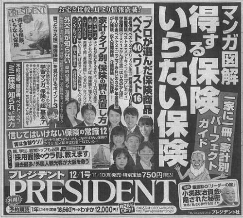 そのお金で何かおいしいものでも食べた方が、生活設計的にはお得。(当たり前)自分の頭で考える・・生活設計。昨日の日本経済新聞に載った広告です。「一家に一冊、家計別パーフェクトガイド」このような生命保険特集は各雑誌が時々取り上げるテーマです。多くの日本人が関心があるテーマなので、買って読んで参考にする人が多い・・ようです。おバカさん・・です。 (失礼!)特別定価750円を払ってこれを買って、記事の内容を参考にして新たに保険に入って・・延々とお金をたれ流します。一生・・保険に加入して、保険料を払うよう誘導しています。あれがいい、これは悪い、・・と、各保険種類ごとに「プロが選んだ保険商品」を紹介しています。保険種類ごとに「良い保険商品」を紹介しています。このようなものを買ってはいけない。読んで参考にしてはいけない。・登場している「プロ」と言われる人たちは、 保険を売ることを生業としている 保険屋さんに過ぎない。 (あるいは、その仲間たち) 生命保険に加入するのが当たり前 という話になるのが当然。 加入するかどうかは消費者の判断で。 「保険のプロ」の話を真に受けてはいけない。 (当たり前) 合法的に・・生涯に渡って、 お金を巻き上げられるだけのこと。・保険種類ごとに良い保険を紹介して、 それぞれに加入するための 選択の指針を示している。 ・終身保険 ・医療保険 ・学資保険 ・個人年金 ・がん保険 ・介護保険 ・・等々の 選び方が分かることになっているが、 生活設計的な視点からは、 これらはすべて、 加入しない方がいい保険です。 (当たり前) ⇒キーワード検索。いずれ・・『保険加入=一定期間の保障を買うこと』であり、『期間が経過すれば、払ったお金は無くなる』のであり、加入中はそれを延々とくり返すことになる。つまり・・『保険加入=お金を失うこと』であり、『保険料=失うお金』・・です。(当たり前)お金は失わない方がいいから、『できるだけ保険には加入しない』・・という前提に立たないと、生活設計はスタートできません。(当たり前)なので、生活設計的には・・『保険以外に方法が無い場合』に限って、限定的に保険加入したい。それも、失うお金総額を認識しながら、しぶしぶ、いやいや、加入する。家計収支を計画する生活設計的には、保険とはそういうものだ。『保険料=失うお金』だから、当たり前のこと。しぶしぶ、いやいや、加入することになるかもしれない保険は、生活設計的視点からは、以下のみ・・だ。これら以外は、加入しない方がお得。(当たり前)・火災保険・自動車保険・収入保障保険 (三角形の死亡保障保険)それぞれを、きちんと比較検討した上で加入すれば、保険料(失うお金)は少なくて済む。生活設計的にお得。(当たり前)家も無い、車も無い、扶養家族もいない、そんな人は保険には入らずに、そのお金をせっせと貯めたい。 また、扶養家族がいても、 必ず死亡保障が必要とは限らない。 きちんと計算した結果・・不要 というケースの方がむしろ多い。 (幼児や赤ちゃんがいても) つまり、収入保障保険さえも 要らない場合も多々ある。 上記の特集では、 「子どもが独立するまでは・・」 保障が必要・・としている。 保険屋さんだから、 保険を売りたいんだから、当たり前。生活設計的には、これだけで素晴らしい人生になる。『できるだけ保険に加入しない』これだけで素晴らしい人生になる。(当たり前)私たち消費者が持つ「常識」は、数十年に渡る長い人生の中で、培われてきています。・・が、その「常識」の元になる情報は、各業界が延々と発信してきたものです。業界の情報発信も数十年に渡ると、世の中に「常識」として定着します。生命保険は、その最たるものです。「生命保険に入るのは当たり前」「生命保険は住宅に次ぐ支出」「医療保険に生涯加入で安心」「子どもが産まれたら学資保険」「老後資金準備は個人年金保険」・・などと、本気で思っているおバカさんへ。(失礼!)保険業界に洗脳されている、・・ということに気づいて、目を覚まそう。できるだけ保険に加入しない方が、生活設計は順調なものになる。(当たり前) ⇒キーワード検索。 「保険で貯蓄してはいけない」 「4つの理由」テレビ、新聞、雑誌、各種業界の広告が満載されています。(情報発信)ぼぉ~っと眺めているうちに、多くの消費者が洗脳されていきます。(常識として定着)マスコミには多額の広告料が入ります。これ・・バカになりません。その結果・・当然にマスコミは、広告掲載業界の意向に反するような情報発信はできません。武田FPのような、広告掲載業者と反対の情報発信をする人(消費者サイドに立つ人)は、まったくの異端児・・ということになります。(^^ゞ商品販売業者と私たち消費者は、『利益相反の関係』 ・・です。マスコミも、中立ではありません。業者側に立っているケースが多々あります。今回取り上げた雑誌の今号は、保険業界サイドそのもの・・