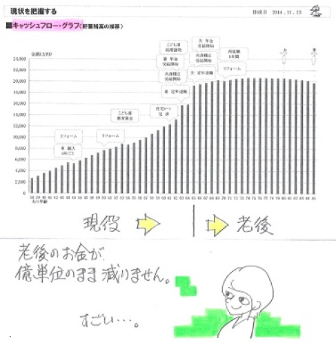 ダイナミックに・・お金をたれ流していっても、老後貯蓄は2億円前後で推移。自分の頭で考える・・生活設計。〇メール顧問会員のHさん(30代) (相談:ライフプランニング)11/13(木)、現状診断が終了。メール添付で送りました。H家の概要 家族 : 30代会社員の夫、 40代会社員の妻、 幼児2人・・の、4人家族。 収入 : 夫:1,009万円 (手取り:774万円) 妻: 780万円 (手取り:610万円) 住居 : 一戸建て持家。(住宅ローンあり) 貯蓄 : 2,197万円。 借金 : 住宅ローン。 2012.12.10 5,500万円 35年返済 金利1.11%~1.51%~1.81% 繰上返済:2013.3 2,600万円 :2014.2 700万円 残債:2,028万円 残債額以上の貯蓄がありながら、 (生命保険でお金をたれ流しながら) 住宅ローンを返済しているのは、 生活設計的に 変なこと・・です。生命保険料 : 105万円/年 (もったいない) 払込保険料総額:3,131万円! (加入保険を全て継続した場合) 死亡保障確保額: 夫:6,634万円 妻:6,166万円死亡保障必要額 検証結果 : 現時点 10年後 夫 -1,242万円 -7,146万円 妻 -4,717万円 -9,371万円 -(マイナス)は不要ということで、 夫婦ともに現在も将来も不要です。 幼児が2人いても、 夫婦ともに死亡保障は不要。 このようなことは普通にによくあることで、 いつも言っているように・・ フルタイムの共稼ぎなら、 夫婦ともに生命保険は不要です。 保険屋さんにだまされないように・・。メールをいただきました。武田さま 佐々木さまお世話になっております。メール顧問会員のHです。現状診断の小冊子をありがとうございました。大変お手間をかけさせてしまったようで申し訳ございませんでした。まだ内容は確認できておりませんが、プリントアウトしてじっくり読ませていただきたいと思います。ブログを読ませていただきました。このまま計画通りいけば、老後は子供達に迷惑をかけることなく、海外旅行も楽しめそうということでひとまず安心しました。まずは住宅ローンの繰上返済と保険の清算を行っていきたいと思います。 ※人生のお金たれ流し2大要因、 住宅ローンと生命保険。 どちらでも・・たっぷり お金をたれ流しています。生涯保険料が3000万超というとんでもない額でびっくり仰天してしまいました。 ※こっちがびっくり仰天しました。 加入を検討する際には 必ず「算数」を行ないましょう。妻の働き方については、仕事と子育ての両立というところから、毎日これでいいのか?自問自答している状態ですので、そのことについても考えていきたいと思っています。 ※妻の働き方をペースダウンしても まったく問題がない キャッシュフローです。現状診断が終了したら、妻が退職した場合のシミュレーションをお願いしたいと思っておりましたので、まずはいただいた資料をじっくり確認し、自分でもいじってみたうえでまたお願いできればと思っております。とり急ぎ、拝受の御礼まで。 ※このキャッシュフロー表を、 自在に使えるレベルになるよう、 がんばりましょう。 たとえば・・働き方が変われば、 将来受け取る年金額が 変わってきます。 老齢年金の計算のページ、 これが理解できれば、 働き方変更のシミュレーションは 自分で自由自在にできます。 分からない場合は、 遠慮なく電話で質問しましょう。 (佐々木FPがいる時間帯に) 分かるまで質問して、 自分で使いこなせるレベルに なりましょう。 それで本当に役に立つ、 「伝家の宝刀」になります。家計改善したい?きちんと生活設計したい?なら・・方法は、1 支出を減らす。2 収入を増やす。これだけだ。 他には無い。 (各種業界にだまされないように)支出を減らすなら・・(できるだけ)1 生命保険に加入しない。2 借金をしない。3 経費を払わない。これだけでいい。すごく かんたん。 見違える人生になる。『うまい話は無い』『「常識」は業界が作っている』『専門家の足し算で、 人生設計はできない。』「常識」に流されていてはダメ。《 生活設計セミナー 》 2時間3万円(+消費税・交通費)。 銀行・証券・保険・住宅会社等にだまされない生活設計。消費者側に片寄った内容の講演。 講師をお受けします。 《 質問希望? 》 ブログ右「キーワード検索」をどうぞ。 「キーワード検索」に言葉 ⇒ 「このブログ内」 ⇒ 「検索」。《 顧問会員希望? 》 「顧問会員って何?」で支援内容や当事務所との関係を確認の上、右記へfpst@axel.ocn.ne.jp 一般の顧問会員は常時受付けていますが、 メール顧問会員は普段、受付けを停止しています。 (受付けをする際は、約2週間前から告知します)