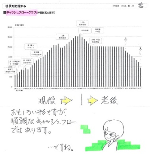 自分の頭で考える生活設計。〇メール顧問会員のKさん(40代) (相談:ライフプランニング)ただ今、行列に並んでいます。 (8番目)メールをいただきました。武田様、佐々木様こんばんは^ ^もうすぐ順番が回ってきそうでドキドキしてます(思っていたより早いですね)楽しみにしてますただのメールでした^ ^〇〇のKより ※ホントに、ただのメール・・。〇メール顧問会員のKさん(30代) (相談:ライフプランニング)7/15に現状診断 終了。K家の概要。 家族:4人。 30代会社員(教育系)の夫、 30代会社員の妻、 幼児、 赤ちゃん(もうじき産まれる)。 希望:マイホーム。 第3子。 住まい:賃貸(家賃:15万円/月) 収入: 夫 793万円/年。 (手取り:632万円/年) 妻 450万円/年。 (手取り:347万円/年) 貯蓄:2,362万円。 (素晴らしい♪) 負債:なし。 (素晴らしい♪)生命保険料:73.2万円/年 (素晴らしくない!) 終身保険1本、定期保険2本。 おバカさんです。(失礼!)死亡保障必要額: 現時点 10年後 夫 -6,738万円 -9,586万円 妻 -18,553万円 -18,259万円 -(マイナス)は不要ということで、 夫婦ともに現在も将来もまったく不要! 幼児と赤ちゃんがいても不要! 健全な家計なら、普通なことです。 (保険屋に だまされないように・・)メールをいただきました。武田様ご無沙汰しています。メール顧問会員のKです。〇月〇日に無事次〇を出産いたしまして、 ※おめでとうございます!やっと4人での生活が落ち着いてきたところです。さて、会員の期限ギリギリになってしまいましたが、下記の設定でシミュレーションをお願いしたいと思っております。1 第3子が生まれ、かつ3人とも 中学から私立に通った場合2 3年後に住宅購入した場合別途シート等に記入する必要はありますか? ※もちろんです。 第3子誕生はいつか? 住宅取得の繊細は? とか、情報が必要です。ご指示ください。よろしくお願いいたします。 ※生活設計用のヒアリング シートを送りました。〇メール顧問会員のHさん(30代) (相談:ライフプランニング)ただ今、行列に並んでいます。 (7番目)メールをいただきました。こんにちはメール顧問会員のHです。順番が直前に迫ったところですが、ヒヤリングシートを添付の物に差し替え願います。背景としましては第二子を授かることができ、来年の〇月に誕生予定ですので、 ※おめでとうございます!その内容をヒヤリングシートへ追記させていただきました。ご確認願います。 ※了解しました。 月曜から 佐々木FPが着手します。 整理整頓が終わって 「再ヒアリング」を送る日は、 シンプルで好ましい家計なら・・ 火曜日、 生命保険や金融商品漬けで 面倒くさい家計なら・・ 水曜日か木曜日です。(^^ゞ〇メール顧問会員のAさん(30代) (相談:ライフプランニング)昨日(11/28) 整理整頓が終わり、「再ヒアリング」として、メール添付で送りました。行列の6番目・・です。メールをいただきました。(有)エフピー・ステーション武田様、佐々木様お世話になります。メール顧問会員のAです。ご連絡ありがとうございます。「再ヒアリング」のシート、受け取りました。内容確認後、記載の上、返信させていただきます。また、不明な部分に関しては、お電話いたします。受け取り確認のみの連絡で失礼いたします。よろしくお願い致します。 ※こうやって、連絡を頂ければ 非常にありがたいです。 何の反応も無い人も けっこうな割合でいます。 「現状診断」を手間ひまかけて 作成して送っても、まったく 何の反応も無い人もいます。 【 行列のできるFP事務所 】《 現状診断 》 佐々木FP ※基本的に、現状診断の 資料作成作業に専念しています。1 Yさん(40代):回答待ち。(1/31着)2 Kさん(40代):回答待ち。(3/27着)3 Kさん(20代):10/2回答待ち。(6/25着)4 Oさん(40代):11/20回答待ち。(9/8着)5 Oさん(30代):11/25回答待ち。(9/10着)6 Aさん(30代):11/28回答待ち。(9/18着) ⇒ 今日の記事。7 Hさん(30代):9/19依頼着。 ⇒ 今日の記事。8 Kさん(40代):9/20依頼着。 ⇒ 今日の記事。9 I さん(50代):9/22依頼着。10 Yさん(40代):9/22依頼着。11 Gさん(40代):9/29依頼着。12 Yさん(40代):10/10依頼着。13 Mさん(40代):10/15依頼着。14 Hさん(40代):10/25依頼着。15 Kさん(20代):11/4依頼着。16 Kさん(30代):11/25依頼着。17 Iさん(30代):11/28依頼着。《 生活設計シミュレーション 》 武田FP ※毎日、顧問会員の支援作業をしながら、 さらには・・ブログ記事を書きながら、 資料作成作業を行なっています。1 Sさん(30代):住宅取得。回答待ち。(4/3着)2 Aさん(40代):子ども誕生・住宅取得(7/31着) ※残るは、子ども誕生&住宅取得の 合体シミュレーションです。 11/27(木)、住宅取得シミュ終了。 11/14(金)、子ども誕生シミュ終了。3 Kさん(30代):第2子誕生・住宅取得(8/26着) ※9/30第2子誕生シミュレーション終了。 11/5回答戻る。4 Sさん(20代):第2子誕生・住宅取得(11/10着)5 Kさん(40代):第1子誕生・住宅取得(11/28着) ⇒ 今日の記事。以外に早く自分の番が・・