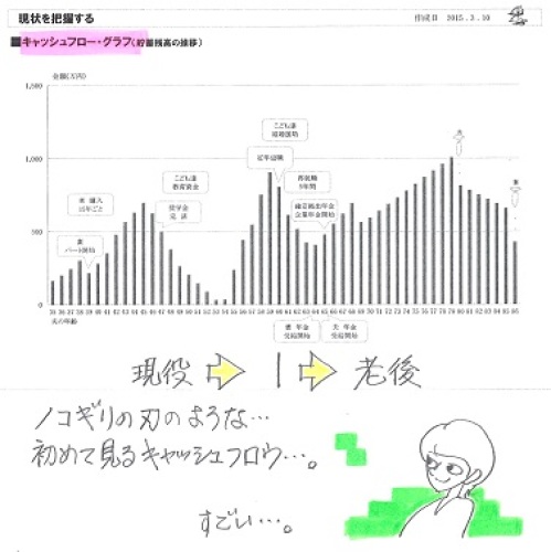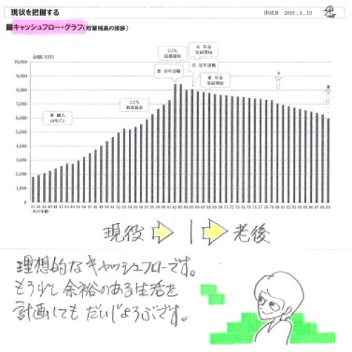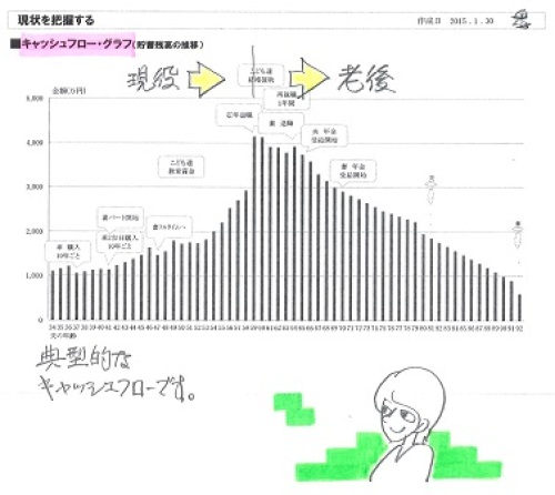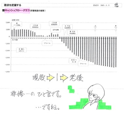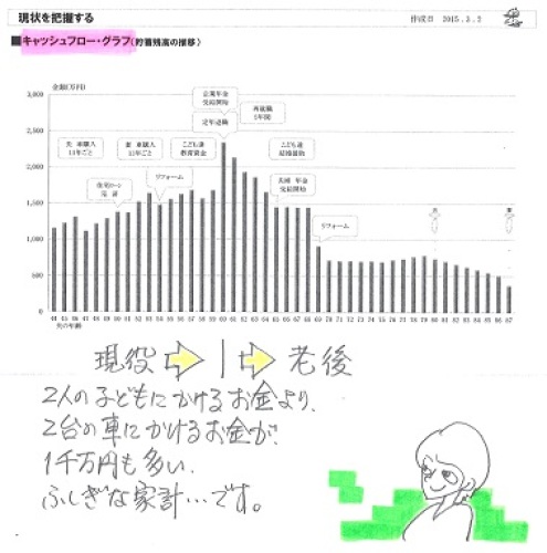 自分の頭で考える生活設計。『 新聞記事を読む 』 ※消費者の視点。「年収は低くないはずなのに?」お金にゆとりが無い人への処方箋2015/3/19 年収は高いのにもかかわらず、 大変な人生になってしまう事例の、 キャッシュフローグラフ(貯蓄残高の推移)です。 当事務所の顧問会員の現状診断時点の実例。 (年収1千万円以上のお医者さん) 衝撃がすご過ぎて・・武田FP、 手書きの漢字を間違えています。厚生労働省が発表した「国民生活基礎調査」によると、1世帯あたり所得の中央値は432万円だそうです。 ※平均値ではなく、中央値。 違いはキーワード検索してみましょう。※ここで言う「所得」は、いわゆる 「年収」のことだと思って差し支えありません。⇒「厚生労働省 平成25年 国民生活基礎調査の概況内、「用語の説明」参照1世帯あたりということですから、共働き夫婦の場合であれば夫婦の年収の合計が「1世帯あたりの所得」ということになりますね。所得金額は人によって大きく差がありますが、「中央値432万円」という数字を見て、「うちはもっとあるな」という方も多いのではないでしょうか。 ※でしょうね。しかし、そんな「平均的な家よりも年収が高い世帯」であっても、貯金が思うように貯まらなかったり、毎月の支払に苦しんでいる家庭も少なくありません。 ※実際によくあります。そこで、今回は「年収が比較的高いにも関わらず生活が苦しいと感じる」家庭への、家計管理への処方箋をお伝えしたいと思います!今と昔で変わったところを探してみる始めから今と同じだけ稼いでいた、という人は少ないはずです。では、今より年収が少ない頃、どのように生活していましたか? 今より年収が少ない頃でも、それなりに生活はしていたんですよね。年収が上がるにつれて、いつのまにか生活レベルを上げてしまった部分があるのではないでしょうか。たとえば、「バーゲンではなく正規価格で服を買う回数が増えた」とか、「月に1回の外食が週に1回になった」など、ご自身の生活の変化を振り返ってみましょう。年収が上がるのに合わせて生活レベルを上げること自体は悪いことではありませんが、生活レベルを上げすぎるとせっかく年収が上がったのに、貯金が増えないどころか家計が赤字になってしまいます。昔の生活レベルを思い返してみて、「本当はこれぐらいでも生活できる」というレベルにまで戻すことで、ゆとりを作り出すことができます。もちろん完全に戻す必要はないので、「ここは今贅沢しすぎているかも」と思うところを改めてみましょう。高年収=お金持ちではないと知る高校生の頃、毎月3万円ほどしか稼げず、「大人になって25万ぐらい稼げる ようになったらさぞかし贅沢できるんだろうなぁ!」なんて思っていませんでしたか? 25万円稼ぐ大人が、高校生と同じように実家に暮らし、マクドナルドで外食を続けているならたしかに贅沢ができるでしょう。きっと、毎回チキンナゲットなどのサイドメニューを食べちゃいます。 しかし、大人になると友達と外食するのに毎回マクドナルドということはありません。飲みに行けばそれだけで3千円ぐらいはかかるでしょうし、一人暮らしをすれば家賃や光熱費もかかります。(実家暮らしでも、いくらかお金を入れる人の方が多いはず)年収300万円のときには、「年収400万円あればさぞかし貯金も増えるだろう」と思っていても、年収が上がるとそれだけ経費が増えることもあるので、思っているほどゆとりはできないものです。もちろん、年収が多いほど使えるお金は増えますが、収入が100万増えたからと言ってお小遣いが100万増えるわけではないということを理解しておかなくてはなりません。むしろ、年収が高くなるほど買えるモノも増えてしまうので、意識的に支出をコントロールする力が必要になります。貯金の仕組みを構成する貯金は、毎月手動で貯金用口座に入金する、なんていうやり方では続きにくいです。財形貯蓄のように、自動でお金が天引きされて、貯金できる仕組みを作るのがおすすめです。それなりに収入がある方にまず確認していただきたいのは、今いくら貯金できているか? ということです。子供の教育資金や自身の老後資金などでいくら必要なのかを算出するとともに、今の時点でいくら貯金できているのかを知ることが必要なんです。 ※目的別貯蓄・・という発想は、 業界による洗脳の結果です。 気を付けたい。自分では「全然貯金できていない」と思っていても、学資保険や終身保険などで貯蓄が継続できている人も案外います。 ※それは・・まずい。 保険で貯蓄をしてはいけない。 4つの理由があります。 ⇒ キーワード検索。月々1万円だけ積立定期に入れていたことを忘れている人もいるかもしれません。すでに貯金の仕組みができている人は、それでも足りない分があれば追加で積立定期預金を申し込むなどして、貯金の仕組みを再構成してください。現時点で、まったく貯金の仕組みができ