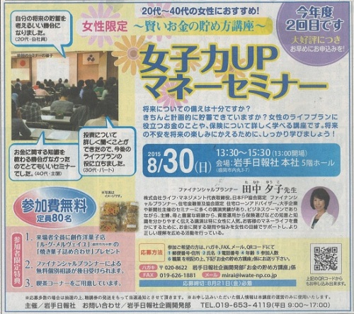 「特典:FPによる無料個別相談」?そんなもの、特典でも何でもない。(当たり前)自分の頭で考える生活設計。『 新聞広告を読む 』 ※消費者の視点。『女子力UP マネーセミナー』2015/8/17 岩手日報広告この手の広告はよく見かけますね。消費者の視点で、この広告を読んでみましょう。〇「マネー」という言葉。 「マネーセミナー」のように、 「マネー」と言う言葉をよく使うのは、 金融業界の人か、その仲間。 「マネー」を連発する人は、 「資産運用」や「投資」の必要性を 説いて、ビジネスへ誘導します。 うまく誘導できれば、 彼らは手数料収入を 安定的に得ることができます。 生活設計に「マネー」は不要です。 堅実に生活設計しましょう。 消費者を惑わす「マネー」という言葉、 私・・武田FPは大嫌いです。 お金(マネー)に振り回されない人生を。〇「参加費無料」「菓子プレゼント」 「タダな上に お菓子までもらえる♪」 ・・と喜んだ人は、おバカさんです。 セミナーのような催しを行なえば、 必ず費用がかかります。 お菓子のプレゼントをすれば、 さらに費用がかかります。 だれかがこの費用を負担します。 新聞社が自ら費用負担して催しを 行なうわけがありません。 費用負担するのは、「業界」です。 このセミナーの内容からして、 金融業界とか保険業界とか・・です。 主催も問い合わせ先も新聞社にして、 業界名や企業名は出さずに カムフラージュしています。 よくやる手・・です。 業界名が出ると集客が難しくなるので、 新聞社を前面に出しています。 マスコミと各種業界は持ちつ持たれつ ・・です。 (当たり前) 各種業界からの広告料収入は、 マスコミにとって非常に大切です。 セミナーを開催したい・・となれば、 マスコミは全面的に協力します。 (当たり前)〇FPによる無料個別相談 後日受けられる特典というのが、 FPによる個別無料相談。 これは「個別無料相談」ではなく、 ただの「個別営業行為」に過ぎない ・・んですが。 「個別無料相談」ということにして、 「個別営業行為」を行なうのが、 セミナーを主催した業界のFPです。 当然 何かを売る人たちです。 こんなものは、特典でも何でもない。 (当たり前)〇日本FP協会認定 ファイナンシャルプランナー 日本FP協会認定なのであれば、 CFPなのか? AFPなのか? ・・を明示するのが当たり前ですが、 ただ ファイナンシャルプランナー と、書かれています。 そもそも、 「ファイナンシャル・プランナー」 であって、 「ファイナンシャルプランナー」 ではありません。〇教科書通りのマネーセミナー。 業界の教科書通りの内容と思われます。 (当たり前) だから、講師の依頼を受けられる。 将来は不安がいっぱいなので、 各種資金準備に資産運用が必要で、 その方法は色々あり、 また、家族の生涯の安心のために 適切に生命保険等に加入を続けたい、 ・・で、 将来の不安を楽しみに変えよう。 のような話をすれば、 参加者や主催者(業界)に喜ばれます。 (次もまた、講師の依頼がもらえる)岩手に限らず、日本全国で同様のことが行なわれています。「無料」ほど、高いものは無い。「マスコミは中立だ。」・・と思っている人は、おバカさんです。各業界と持ちつ持たれつ・・なのは、当たり前のことです。頭を切り換えよう。気を付けよう。「常識」は業界が作っている。「常識」はマスコミが作っている。自分の人生、自分の頭で考えよう。 無料セミナー ・・っと。《 質問希望? 》 ブログ右「キーワード検索」をどうぞ。「キーワード検索」に言葉 ⇒ 「このブログ内」 ⇒ 「検索」。《 セミナー講師? 》 2時間3万円(+税・交通費)。 銀行・保険・住宅会社等に振り回されない生活設計。 消費者側に立った内容の講演。 講師をお受けします。 《 顧問会員希望? 》 「顧問会員って何?」で支援内容や当事務所との関係を確認の上、右記へfpst@axel.ocn.ne.jp会員受付けは「一般」は常時、「メール」は月日指定受付け。