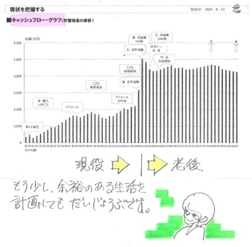 はっきり、2倍の差がありました。自分の頭で考える生活設計。『 ネット記事を読む 』 ※消費者の視点。1000万円以上貯蓄者は、0円の人に比べコレが2倍!2015.8.17 All About西山 美紀さんという人のお話。「生活設計」への考え方…あなたの場合は?今回は、貯蓄が1000万円以上ある人と、貯蓄が少ない人のデータを比較してみました。金融広報中央委員会「家計の金融行動に関する 世論調査[二人以上世帯調査]」(2014年)の「生活設計策定の有無」から読み解きます。ぜひ、ご自分の場合と比べながらご覧ください。 ※当記事の「貯蓄」とは、 「金融資産」全体のことをさします。 預貯金だけでなく、株や投資信託などの 流動性の高い金融資産も含みます。 また一部、ガイドが データを再集計して算出しています。「生活設計を立てている」割合に大きな差が!「あなたは、生活設計を立てていますか」と聞かれたら、以下Aタイプ、Bタイプ、Cタイプのどの回答になるでしょうか。「生活設計を立てている」…Aタイプ「現在生活設計を立てていないが、 今後は立てるつもりである」…Bタイプ「現在生活設計を立てていないし、 今後も立てるつもりはない」…Cタイプでは、貯蓄0円の人、貯蓄1000万円以上の人、中間くらいの貯蓄400~500万円の人の回答の割合を見てみましょう。●貯蓄0円… Aタイプ22.5% Bタイプ44.7% Cタイプ30.8%●貯蓄400~500万円未満… Aタイプ38.5% Bタイプ46.7% Cタイプ13.9%●貯蓄1000万円以上… Aタイプ50.4% Bタイプ28.7% Cタイプ20.8%貯蓄0円の人のうち、Cタイプ「生活設計を立てていない」と答えた人は3人に1人と、高い割合になっています。一方、「生活設計を立てている」というAタイプは、2割ほど。貯蓄400~500万円未満の人になると、Aタイプが4割近くに増えます。では、貯蓄1000万円以上の人はどうでしょうか。Aタイプが半分以上と、いっきに増えます。貯蓄0円の人(22.5%)に比べると、その割合は2倍! 「生活設計を立てている」ということと、貯蓄額との関係性が高いことがよくわかりますね。「今後は生活設計を立てるつもり」というBタイプにも注目!次に、「現在生活設計を立てていないが、 今後は立てるつもりである」というBタイプの割合を見てみましょう。「貯蓄0円の人」と「貯蓄400~500万円未満の人」では、Bタイプが半分もいますが、「貯蓄1000万円以上の人」では、Bタイプは約3割と少なくなっています。実は、「現在生活設計を立てていないが、 今後は立てるつもりである」というBタイプの人は要注意! 「~するつもり」と思っていても、ずるずる先のばしになって、結局着手でないままという経験はないでしょうか。「明日からダイエットをする“つもり”」と言っていたのに、翌日も同じことを言っているパターンに似ていますよね。ぜひ、Bパターンの人は、少しでも早く生活設計を立て始め、Aタイプになることをオススメします。貯蓄が1000万円以上あっても、生活設計を立てることは大切貯蓄1000万円以上の人は、他の貯蓄額の人に比べると、AタイプかCタイプの割合が多めです。「貯蓄1000万円以上の人」でCタイプの人は「貯蓄が多く余裕があるので、 生活設計については必要がない」と考えているのかもしれません。今はいいとしても、10年後、20年後になると状況が変わるかもしれないので、貯蓄に余裕があるという人も、ぜひ一度生活設計を立ててみてはいかがでしょうか。以上、「生活設計」についての考え方を、貯蓄1000万円以上の人、貯蓄400~500万円の人、貯蓄0円の人で比較してみました。Bタイプ、Cタイプの人は、「生活設計を立ててみる」ことに、少し関心がわいたかもしれません。( 略 )もうすぐ9月、今年度の後半戦に入ります。ご家族で「生活設計」についてぜひ話しあってみてくださいね。 ※ まったく同感 ・・でした。 【 業務日記:行列のできるFP事務所 】 【 佐々木FP 】 ※今月の佐々木FP。 8月28日(金)と31日(月)は、 お休みをいただきます。 電話質問等ある方はご注意下さい。 《 事務所会計作業 》 《 現状診断☆ & 生活設計★ 》1 Yさん(40代):☆12/29回答待ち。(10/10着)2 Kさん(20代):☆1/14回答待ち。(11/4着)3 Kさん(30代):☆2/6回答待ち。(11/25着)4 Sさん(30代):☆7/8回答待ち。(7/4 着)5 Kさん(30代):☆8/12回答戻る。(7/23着) ※今日の作業。 現状診断終了予定は、 8/19(水)と書きましたが、 8/20(木)になりそうです。 スミマセン! 確認事項があるので、 電話をお願いしていましたが、 今日は来ませんでした。6 Kさん(30代):☆7/24現状診断 依頼着。7 Oさん(30代):☆7/27現状診断 依頼着。8 Hさん(30代):★7/29生活設計 依頼着。9 Sさん(20代):☆7/30現状診断 依頼着。10 Mさん(30代):☆7/31現状診断 依頼着。11 Hさん(30代):☆8/10現状診断 依頼着。12 Sさん(30代):☆8/18現状診断 依頼着。 ※本日、提出資料が届きました。生活設計を立てている ・・っと。《 質問希望? 》 ブログ右「キーワード検索」をどうぞ。「キーワード検索」に言葉 ⇒ 「このブログ内」 ⇒ 「検索」。《 セミナー講師? 》 2時間3万円(+税・交通費)。 銀行・保険・住