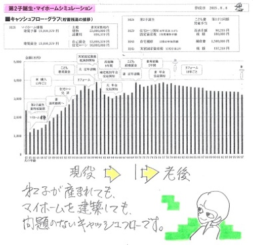 完璧な老後資金不足!・・です。自分たちが決めたマイホーム取得で突っ走ってしまわなくてよかった。自分の頭で考える生活設計。〇メール顧問会員のKさん(30代) (相談:ライフプランニング)2015.8.24 現状診断・・終了。人生が成り立たない、ひどい内容です。今日、電話をいただきました。土地を買ってマイホーム建築をする・・という内容で、現状診断資料を作りましたが、土地はご破算、白紙に戻り、ハウスメーカーも白紙に戻した方がいい、経費高の業者です。ひどいキャッシュフロー・・で、人生が成り立たない状況なので、一旦すべてご破算にした方がいいです。たまたま出会った業者と仲良くなって、いっしょに計画を進めてはいけません。土地を買ったり、住宅建築業者を決めたり、・・ということは、自分たちが素人のままでやってはいけない。つまらないものをつかまされたり、とんでもない高い買い物をしたりします。不動産屋さんと話したり物件を見たり、住宅展示場を何度も見に行ったり、色々な業者の話を何度も聞いたり、・・のようなことをくり返していくと、自分たちの目が肥えていきます。充分に目が肥えてから・・住宅会社3~5社を並行して検討して、(競合相手がいることを意識させながら)契約直前まで業者を決めない。最後の最後で、確信を持って業者を決めて契約しましょう。そのためには時間が必要です。2~3年後のマイホーム取得を奨めました。そのためのシミュレーションは、現時点で行なうことは可能です。キャッシュフローの改善も必要で・・方法は、1支出を減らす 2収入を増やす・・の2つしか無いわけですが、K家の場合は・・1支出を減らす・・が、ちょっときつい。せいぜい生命保険の清算でいくらか・・。2収入を増やす・・は、妻の働き方で改善の余地がありそうです。《 K家の概要 》家族 : 30代会社員の夫、 30代会社員の妻、 幼児と赤ちゃん ・・の、4人家族。 希望 : マイホーム取得。 住居 : 実家住まい。 貯蓄 : 1,289万円 借金 : なし。 生命保険料 : 24.6万円/年死亡保障必要額 検証結果 : 現時点 夫 -470万円 妻 1,930万円 算出していますが、 人生が成り立たないCFに 基づいているので、 現時点はともかく、将来については、 意味を成しません。すべてご破算 ・・っと。真に消費者側に立つために、いっさい 商品販売をしないFP事務所です。 業界や業者と しがらみが無いFP事務所です。 《 質問希望? 》 ブログ右「キーワード検索」をどうぞ。「キーワード検索」に言葉 ⇒ 「このブログ内」 ⇒ 「検索」。《 セミナー講師? 》 2時間3万円(+税・交通費)。 銀行・保険・住宅会社等に振り回されない生活設計。 消費者側に立った内容の講演。 講師をお受けします。 《 顧問会員希望? 》 「顧問会員って何?」で支援内容や当事務所との関係を確認の上、右記へfpst@axel.ocn.ne.jp会員受付けは「一般」は常時、「メール」は月日指定受付け。