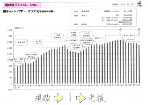 一時、一条工務店に洗脳されていた、K(妻)です。自分の頭で考える生活設計。〇メール顧問会員のKさん(30代) (相談:ライフプランニング)2015.8.24 現状診断・・終了。 人生が成り立たない、ひどい内容でした。住宅取得で人生が成り立たなくなるその後・・11/17のシミュレーションで、まともな人生になりました。マイホーム取得もなんとかなりそうです。 家計改善後のキャッシュフロー。 マイホーム取得後のキャッシュフロー。 マイホーム取得後の 夫婦それぞれの死亡保障必要額。メールをいただきました。( 前半からの続き )現在、新たに地元工務店を発掘して話を聞いてまわっております。そこで質問があるのです。今回解約した一条工務店に決める前から一条工務店と同様に比較していた地元工務店が数社ありました。武田FPのブログに出会う前のことですので、私たちの予算をすでに話し済みなのですが、そこも今後対象にしてもよいものでしょうか。 ※生活設計をしたことが無い 人が言う「建築予算」なんて、 まったく何の根拠も無い。 あって無いようなもの。 「生活設計してみたら・・ 予算が変わってしまって・・。」 「いくらになりました?」 「ないしょ。」 ・・と、ぼかせば、OK。最後に候補に残ったとしてもコンペをする意味がないように思うのですが、こういった場合どうしたらよいのでしょうか。。 ※当事務所がやるからコンペだが、 素人の場合は・・ そもそもコンペにはならない。 同じ設計図書で・・とはいかない、 ほぼ近いような内容での 比べっこになります。工務店を回ると「土地探ししますよ!」と言うところがあります。そういったところへは、「まだここで建てると決まった わけではないので、結構です」と断ったほうがいいのですか?中には「家はうちで建てて欲しいけれども、 土地だけ購入でも構わない」というところもあるのです。それでも紹介してもらったらなんか悪い気がして紹介してもらったところで建ててしまいそうで・・・「自分で探すので、大丈夫です!」とハッキリ言ったほうがいいのでしょうか? ※建築請負業と宅建業の両方を やっている業者は多いです。 「土地購入だけで構わない」 というところなら、 堂々と依頼すればいい。 売買契約が成立すれば、 仲介手数料を払うわけだから、 「なんか悪い気がして」 などと感じる必要は無く、 その後・・複数の住宅会社を しっかり比較検討したい。 これが・・宅建業をやっていない 業者が、「探します。」と言う場合は、 依頼してはいけない。 義理が生じて、 合理的な判断ができなくなる。また話しは変わりますが、現在住んでいる私の実家の土地問題ですが、財務局に申請をして、無事に白地は国有地化になりました!あとは測量→払い下げと進むわけですが、(ほかに問題があり法務局へ行ったり、 測量会社へ行ったり として色々な知識を得ているところです。)これも結構時間がかかるようです。来年度中に測量まで進めばありがたいという状況です。もし今の家の前の道(国有地)の払い下げをして手に入ったとしたら・・・。今の場所で建替えするという案も考えてみました!しかし、母からの収入がなくなるので、やはり新たな場所での建築のほうが安かったりもするような・・・でも固定資産税は2重に払わなくていいからやっぱり建て替えがいいのか・・・家の解体費、仮住まい費用などもかかるでしょうし、色々悩み中です。武田FPはこういったケースでの生活設計はされたことはありますでしょうか。 ※まったく同じケースをやりました。 ・・などということはない。 生活設計のパターンは無限にある。 どんな可能性についても、 それぞれシミュレーションして 比較検討するのも、生活設計。 やってみればいい・・だけのこと。まだまだ土地と建物の勉強中。時間はありますので、慌てず取り組みたいです。最後にホームビルダー購読しました。難しい言葉も多くありますが、楽しいですね。これからも読み続けたいと思います。 ※建築業者向けの月刊誌だからこそ、 建てる人の役に立つ情報が満載。 2シーズン・・読んでみれば、 建てる家も、依頼する業者も、 素人の時とは全然違うことになる。いくつかの質問があり長い内容なってしまい申し訳ございません。それでは、このたびは生活設計本当にありがとうございました。 ※この言葉を、1ヶ月前に欲しかった。 (^^ゞ《 K家の概要 : 現状診断時点 》家族 : 30代会社員の夫、 30代会社員の妻、 幼児と赤ちゃん ・・の、4人家族。 希望 : マイホーム取得。 住居 : 実家住まい。 貯蓄 : 1,289万円 借金 : なし。 生命保険料 : 24.6万円/年死亡保障必要額 検証結果 : 現時点 夫 -470万円 妻 1,930万円 算出していますが、 人生が成り立たないCFに 基づいているので、 現時点はともかく、将来については、 意味を成しません。感想は、すぐ欲しい! ・・っと。〇 商品販売をしない。 〇 しがらみを持たない。誇りをもって、愚直に、消費者側に立ち続けて15年目の 