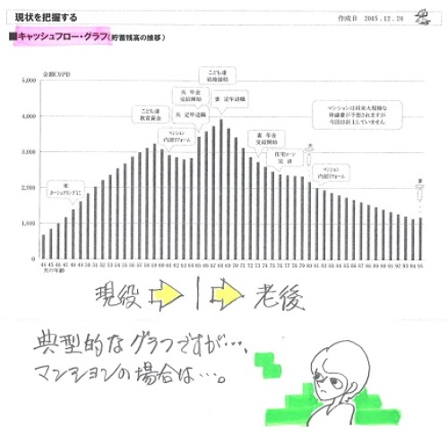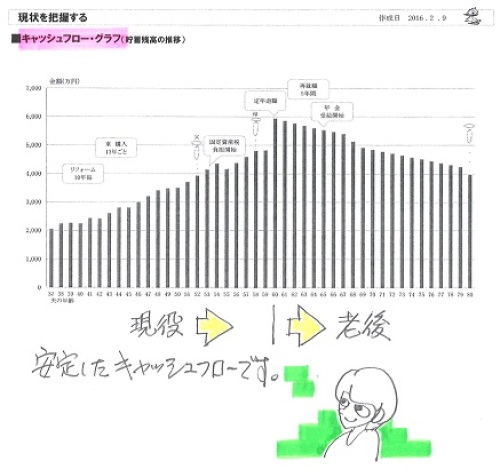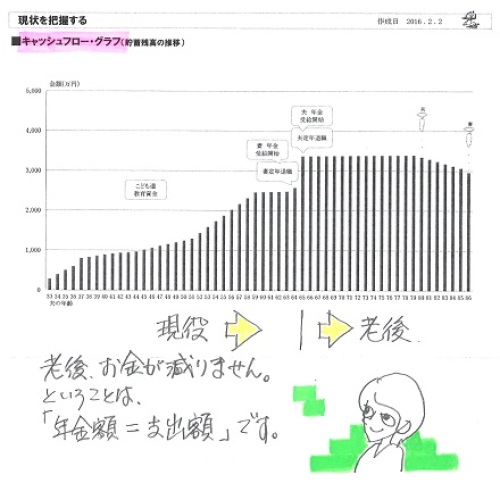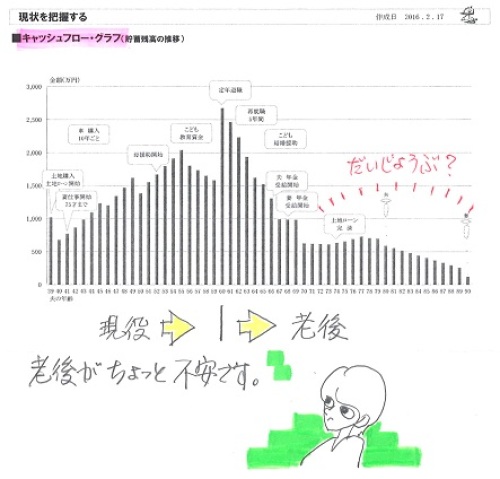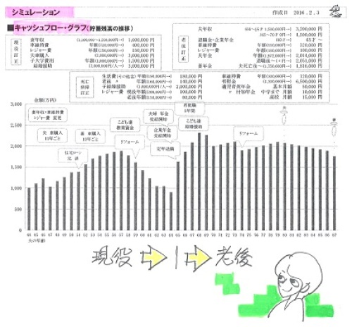 お伝えした御礼の品ですが、2/16の午前中に届く予定です。喜んでいただければ幸いです。ありがとうございます!ボランティアで無報酬の武田FP、もう・・これだけが唯一の楽しみです!ごちそうになります!(って、食べ物とは限らない・・か)自分の頭で考える生活設計。〇メール顧問会員のDさん(40代) (相談:ライフプランニング)2015.3.3、現状診断 終了。2016.2.3、生活設計 終了。 死亡保障必要額の大幅な減額には・・つくづく医療保険を解約して良かった老後も大丈夫という結果が出て安心メールをいただきました。先日は生活設計シミュレーションをありがとうございました。修正後のCF表を元に楽しく生活したいと思います。 ※「伝家の宝刀」、 しっかり自分のものにして、 使いこなしていってください。さて、前回お伝えした御礼の品ですが、2/16(火)の午前中に届く予定です。喜んでいただければ幸いです。 ※ありがとうございます! 楽しみに待ちます。 無報酬でFP事務所を運営 している武田FPとしては、 日本全国のおいしいものが いただけるのが、 唯一の楽しみです。 待ち遠しい・・です。電話番号は、教えていただいた通り操作したら出てきました。 ※電話番号を教えて ・・って、言われました。前に電話したことがあったのに、おバカな質問をしてしまって ※ ホントに・・。すみませんでした(#^.^#)冬本番、武田様はスキーを楽しんでいらっしゃることと思います。 ※それが・・今シーズンは、 ぜんぜん楽しんでいません。 自宅でケガをしてしまい、 スキーにはほとんど 行けていません。 夜中に階段を下りていて、 これで最後・・と思って降りたら もう一段あった!・・ために、 思いっきり転んで、 右足の親指付近が腫れて 内出血で紫色に、 右の臀部(お尻の筋肉)も 思いっきり強打して 内出血のアザがまだ消えません。 整形外科でレントゲンを・・ 幸い骨折は無かったが、 3週間ほどビッコをひいて 歩いていました。 今は一応普通に歩けるけど、 まだまだ違和感はあります。 ケガはかなりの割合で 自宅で発生しているようです。 皆さんもお気をつけてください。そちらは特に寒いと思いますので、お二人とも体調にお気をつけくださいね。 ※はい、気をつけます。それでは失礼いたします。メールをいただきました。何度もすみません。もう1点訂正があります。加入保険: AIGスター生命 ⇒ チューリッヒ生命 です。よろしくお願いします。 ※またまた、失礼しました。 さっそく、直しました。生活設計シミュレーションの結果、 老後の不安が消えました。死亡保障必要額も、少なくなりました。 《 D家の概要:現状診断時点 》家族:4人。 40代会社員の夫、 40代パートの妻、 小学生、幼児。 相談:教育費・生命保険 住まい:一戸建てマイホーム。 土地:89坪 建物:43坪 収入: 夫 625万円/年。 (手取り:489万円/年) 妻 110万円/年。 (手取り:108万円/年) 貯蓄:1,086万円。 負債:無利子の住宅ローン。(親から) 70,000円/月 H33年12月まで 残:588万円生命保険料:2.8万円/年 杯込総額33.7万円 夫 チューリッヒ生命:収入保障保険 (死亡保障額:2,160万円) 2.8万円/年 杯込総額33.7万円死亡保障必要額: 現時点 10年後 夫 4,228万円 738万円 妻-3,490万円 -1,935万円 「必要資金」から「手当可能資金」を 引いた結果ですので、 -(マイナス)は保障不要ということです。 【 業務日記:行列のできるFP事務所 】 ※行列掲載記事は、タイトルに★印。 【 佐々木FP 】《 事務所会計作業 》 《 現状診断☆ & 生活設計★ 》1 Tさん(30代):☆12/11再ヒア待ち。(11/24着)2 Mさん(30代):☆2/12回答戻る。(12/19着) ※メールをいただきました。 お世話になっております。 先ほどは佐々木さん、 優しく教えていただき ありがとうございました。 再ヒアリングシート、お送りします。 FP先生、 先日はまた記事にしていただき、 ありがとうございました。 まずは現状診断ですよね。 突っ走ってしまいすみませんでした。 ⚫︎突っ走って色々考えましたが、 予定としてはフラット一本の予定で、 つなぎ融資を受けるつもりです。 ⚫︎子供が大きくなったら、正社員で 一日働きたいと思っているので 40ウン歳から年収を増やして みました。 ⚫︎佐々木さんにお話しした 固定資産税は2月3月分でした。 ⚫︎主人の死亡退職金ですが、 会社以外から下記の金額が 出るようです。 ( 略 ) 子供から目が離せなくなってきて、 バタバタしてしまい、 落ち着いて文章が書けなくて なんだか乱文ですみません。 また足りない部分や不明な点が ありましたらご指摘ください。 現状診断、ドキドキしながら待ってます。 よろしくお願いします。3 Iさん(30代)12月:☆2/10回答戻る。(12/29着) ※今日の作業。 再着手しました。 現状診断終了予定は2/16(火)です。 お楽しみに・・。4 Iさん(30代)10月:☆2/10再ヒア待ち。(12/31着)5 Uさん(40代):☆1/8 現状診断 依頼着。6 Iさん(30代):★1/12 生活設計 依頼着。7 Kさん(30代):★1/25 生活設計 依頼着。8 Wさん(30代):☆1/26 現状診断 依頼着。9 Kさん(20代):☆1/29 現状診断 依頼着。10