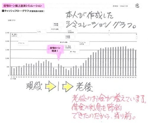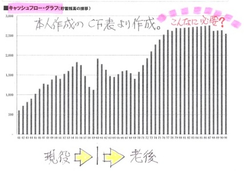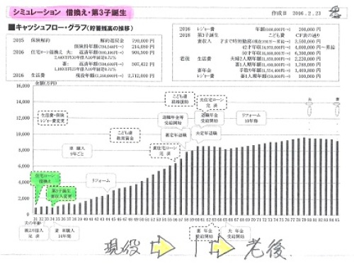 マイホーム建築が結果オーライだとすると、家計が大変な理由は、どこか別のところにありそうです。自分の頭で考える生活設計。〇メール顧問会員のSさん(40代) (相談:ライフプランニング)2016.1.29 現状診断・・終了。 住宅ローンの借換えを検討中です。住宅ローンを借換えする? それとも10年固定とフラット どっちを選ぶ?10年固定住宅ローンは無理でした住宅ローン 15年固定ならなんとか家も車も全額ローン 当然 割高な人生に思いっきり、家計改善してみました!地元の小規模工務店で建てました★メールをいただきました。こんばんはお世話になっております回答をありがとうございます先日作成した基本生活費見直し後のCFと武田さん作成のグラフをみると、たしかに老後にお金が溜まっていくのですが、繰り上げ返済とローン借り換えを考慮していないのであのような結果になりました実際は現役中完済をめざし、繰り上げ返済(貯蓄減)が発生するので老後もそれほど貯まりません(自分でグラフつくって確認) ※もうすっかり、「伝家の宝刀」を 自分の身体の一部として 使いこなしているようです。 素晴らしい・・。 顧問会員がこんなふうに なってもらうと、私もうれしい。現役中は多少潤いがない生活になったとしても破綻するよりはマシ・・・・と思えば気が楽です ※同じ状況にいながら・・ 「伝家の宝刀」を持っていない人や、 生活設計の意識が無い人は、 かなり危険です。車購入をずらしたり、ランクを落とすだけでもマシなグラフになるので、 ※この「車の購入」がけっこう 家計に大きな影響を与えます。 いくらの車を? 何年スパンで? 「車の購入」だけで家計が傾く ケースもあります。毎年見直しをしていこうと思います現役中は我慢も必要になってきますが、その分完済後は夫婦でちょっとした旅行をしようねと約束しましたやはり完済すると肩の荷がおりますよね ※借金は、無い方がいい。 (当たり前)伝家の宝刀があり、使いこなせば、ちょっとした変化にもすぐに気づき自分たちで改善策が講じれます ※Sさんのように使いこなしたい。 せっかくの「伝家の宝刀」も、 床の間に飾ったままで・・ 「伝統の家宝」にしている人もいる。ありがとうございます あまり不安がらず、堂々と生活してこうと思います住宅ローンの借り換えも予定通り15年で大丈夫ですので審査を継続してやっていきます住宅の暴走・・・・・・ やっちまったぁですね ※ところが、そうでもない・・ようです。 ここまで色々話を聞いてきて、 だいぶ全容が見えてきました。 S家のマイホーム建築は、 ほぼ、結果オーライのようです。後悔しても昔にはもどれないので、今後は馬鹿にならないよう意識して買い物するようにしますしまた、娘にもお金の教育という意味で模範にならないといけないので気をつけます洗脳されている国民がおおいので、学校教育や職場でも正しい思考が身につきにくいと思います(お金に関しても) ※私が常々言っているようなことは、 学校で教えることはありません。 そもそも、先生たち自身が ほぼ例外なく、 しっかり洗脳されたおバカさん (失礼!)だから、 教えられるわけがない。そこはしっかり親が教えていかないといけないんだなと感じました ※そのために・・まず、 親が目を覚ます必要があります。住宅取得時にも絶対やってはいけないことをしたようでもう我が家はどうしようもないですね・・・・・ ※業者選びに関しては、 結果オーライ・・のようです。値引きはごねてたくさんしてもらいましたが(たくさんという表現は怪しいですが)、そもそもが適正価格ではないかもしれません相見積もりもしていません(最大級のオバカと太鼓判おされましたね) ※複数の業者を比較すると・・ 適正価格が見えてきます。 それを知った上で、 確信を持って業者を選び、 契約したい・・ですね。おわったことなので、リフォーム時に気をつけます高気密高断熱に関しては、立会の気密測定検査を実施して報告書もありますし、そういう工法の家なので恐らく大丈夫だと思います(騙されてはいないはず) ※なるほど、それならOKです。夫婦でも今回の件で話し合いがもてて、主人の意外な思いとかも聞けたので武田さんの会員になって本当に感謝しておりますありがとうございます ※「生活設計」の作業には、 夫婦の会話が深まる・・という うれしい副産物が伴います。主人にはこれ以上お金の苦労をかけたくないので、私がしっかりと伝家の宝刀を使いこなして今後の人生何かトラブルが起きても対処できるようにしていこうと決意のような(大げさですが)ものをたてました生活設計はこれからですので、末永くおつきあいよろしくお願いいたします ※はい、これでほぼ全容が見えました。 S家のキャッシュフローはちょっと 大変な状況になっていますが、 その原因は・・ 「住宅取得時にやってはいけない事」 ・・として、本人は 「建築業者を1社にしぼって 打ち合わせ、そのまま契約した」 こ