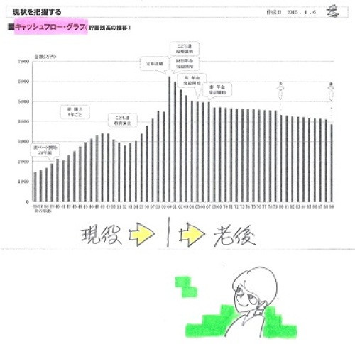 この金額なら土地が高い今の居住地でもなんとかなるような気が。 自分の頭で考える生活設計。〇メール顧問会員のIさん(30代) (相談:ライフプランニング)2016.2.15 現状診断 終了。現地を見ずに住宅建築は手伝えるか?大手ハウスメーカーの戸建て賃貸が★メールをいただきました。メール顧問会員のIです。現状診断の作成ありがとうございました。貯蓄はそれなりにしていたつもりでしたが、これほどのキャッシュフローになるとは全く期待していなかったので非常に驚きでした。退職金がないこともあり老後の心配があったのもグラフを見て逆に安心感に変わりました。曖昧でもやもやしていたものを可視化してグラフで確認することは本当重要ですね。 ※ま・・ だれにでも言える事ですが、 勝手に不安を増幅させる前に、 キャッシュフロー表を作ってみる ことです。 漠然とした不安が 具体的な不安になったり、 (具体的なら対処が可能になる) まったく不安は不要だったり、 ・・ということが判明します。 Iさんの場合は、不安は まったく不要だったということです。生命保険についても、マイナスとの診断。 ※「死亡保障必要額」 =「必要資金」-「手当可能資金」 引き算の結果がマイナスなら、 死亡保障は不要・・ということです。夫、妻が死亡した状況を想定して生活の仕方、働き方等をしっかり考えた結果ですので 自信を持って解約できます。 ※きちんとした根拠に基づいて、 得られた結果なので、 胸を張って解約しましょう。いらないものに120万ものお金を払う必要はないですからね。 ※120万円があれば、 色々なことができます。 保険屋さんにプレゼントしている 場合じゃない。年金については学特や未納期間があったりして基礎年金が満額受給出来ていないので、60歳以降の任意加入期間に支払って満額受給したいなと。 ※そうしたいですね。キャッシュフローを弄ってみてどのような老後になるか見てみたいと思います。マイホーム取得に関して一つ質問があります。現状の設定ですと総評にもありましたように借り上げ社宅の恩恵もあり、現役時の住居費が極端に少なく住居費総額が2439万円、妻死亡時の貯蓄は3287万のため合計5726万でマイホーム取得での住居費総額を考えることになります。 ※はい、そう説明しています。ヒアリングシートに書きましたがマイホームを取得した時点で、基本給から引かれている家賃負担分、また持ち家でも家賃手当の上限の半額は支給されるので月給で5.4万円、年額で64.8万円、年収が増えることになります。 ※これ・・、初耳でした。 私(武田FP)は終了した現状診断 の資料にしか目を通しておらず、 その状況で「総評」を書いています。 重要な情報でしたね。 こちらの内部連絡不足でした。 スミマセンでした!定年まで24年で約1550万、社会保険料、税金を考慮して0.8掛けの1244万を上乗せしてマイホーム住居費総額6970万円で考えることは出来ないでしょうか? ※はい、それはもちろん可能です。(実際は給与が上がって 平均月収も増えるので 年金も多少増えますが ざっくりなので無視します。) ※本来は、無視しないで・・ きちんと考慮していきたい。この金額なら土地が高い今の居住地でもなんとかなるような気がします。 ※う~ん、それはどうかな? ・・という印象です。 『住居費総額』は「総評」で 書いたように、以下の総和です。 イニシャルコスト 土地代= 建築費= 諸費用= ランニングコスト 住宅ローン利息総額= 固定資産税・都市計画税総額= リフォーム代総額= そちらの状況が分からないので、 すぐここで具体的な数値を 入れて試算することは できませんが・・ 土地が高額な場所柄では、 イニシャルコストだけで かなりの金額になってしまいそう です。 『住居費総額』が5,700万円から 6,900万円になったとしても どうなのかな・・? のように見えますが・・ 自分で具体的な数値を入れて やってみてください。 「生活設計シミュレーション」を きちんとしたい場合は、 意思表示してください。 改めてヒアリングシートを送ります。現状診断のボリュームが大きいのでまで全て見きれていませんが、まずは内容の理解(特に年金関連)とキャッシュフローを弄ってみていろいろな人生を体感したいと思います。 ※この「伝家の宝刀」を、 自分のものとして自由自在に 使えるようになるためには、 「年金」を理解する必要があります。 「老齢年金」も、「遺族年金」も 自分のものにしてしまいたい。生活設計、マイホーム取得とこれからが本番ですが、まずはこのような貴重な資料を作成して頂いたこと、本当にありがとうございました。 ※一家族の「現状診断」資料作成に、 平均5日間を要しています。 まさに貴重な我が家の資料です。 大切に、役立ててください。《 I家の概要:現状診断時点 》家族:3人。 30代会社員の夫、 30代専業主婦の妻、(後にパート) 赤ちゃん。 相談:マイホーム・第2子・生命保険。 住まい:社宅。(家賃:1.3万円) 収入: 夫 561万円/年。 (