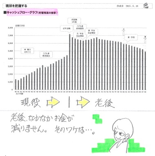 住宅ローン返済開始後の人生、シミュレーションしたいので・・。 自分の頭で考える生活設計。〇メール顧問会員のKさん(40代) (相談:ライフプランニング)2015.5.18、現状診断終了。2015.6.17、マイホーム取得シミュレーション終了。メールをいただきました。お世話になっております。昨年3月にメール顧問会員になりましたKです。このたび中古住宅を購入し、先月決済を終えました。 ※おっ! すごい!事前にマイホーム取得シミュレーションをしていただいていたので、スムーズに決断できました。 ※よかった、よかった。ありがとうございます!そこで、住宅ローン開始後の人生について再度シミュレーションをお願いしたいと考えています。ご対応していただけますでしょうか。それでは、よろしくお願いします。 ※生活設計のヒアリングシート、 メール添付で送りました。《 K家の概要 : 現状診断時点 》家族 : 40代公務員の夫、 30代自営業の妻、 子ども4人(小学生2人 保育園2人) ・・の、6人家族。 希望 : マイホーム取得。 収入 : 夫: 787万円 (手取り:605万円) 妻: ーー万円 (手取り:250万円) 住居 : 賃貸。(家賃6.5万円) 貯蓄 : 1,213万円。 借金 : なし。 生命保険料 : 64万円/年 (もったいない) 払込保険料総額:922万円 (加入保険を全て継続した場合) 死亡保障確保額: 夫:5,051万円 (過剰加入!) 妻:1,130万円 (まったくの無駄) 死亡保障必要額 検証結果 : 現時点 10年後 夫 1,574万円 -1,951万円 妻 -2,632万円 -2,566万円 -(マイナス)は不要ということです。 子どもが4人(末子は2歳)いても、 妻は死亡保障不要、 夫はさすがに必要だが、 5年程度で不要になる。 「子どもたちが独立するまでは必要」 などということは、まったく無い。 常識は、業界が作っている。 保険屋さんにだまされないように・・。 【 業務日記:行列のできるFP事務所 】 ※行列掲載記事は、タイトルに★印。 【 佐々木FP 】《 事務所会計作業 》 《 現状診断☆ & 生活設計★ 》1 Tさん(30代):☆12/11再ヒア待ち。(11/24着)2 Kさん(30代):☆2/4再ヒア待ち。(12/14ヒア) ※今日の作業。 本日・・2/9(火)、現状診断 終了。 典型的なキャッシュフローで、 何の問題もありません。 ・・が、細々と・・4本の保険に加入 したままです。 掛金が安く見える・・共済系の 医療保険やガン保険などです。 それでも、このまま継続すれば・・ 約400万円をたれ流します。 このお金があれば、何十回でも 病気になることができます。 こんなものを継続するのは、 生活設計的に明らかに変・・です。 自分の頭で考えよう。 メール添付で送りました。3 Mさん(30代):☆2/8再ヒア待ち。(12/19着)4 Iさん(30代)12月:☆12/29 現状診断 依頼着。 ※今日の作業。 長らくお待たせしました。 整理整頓が終了しました。 「再ヒアリング」として、 メール添付で送りました。5 Iさん(30代)10月:☆12/31 現状診断 依頼着。 ※今日の作業。 長らくお待たせしました。 整理整頓は明日、終了予定です。 お楽しみに・・。6 Uさん(40代):☆1/8 現状診断 依頼着。7 Iさん(30代):★1/12 生活設計 依頼着。8 Kさん(30代):★1/25 生活設計 依頼着。9 Wさん(30代):☆1/26 現状診断 依頼着。10 Kさん(20代):☆1/29 現状診断 依頼着。11 Sさん(20代):★2/5 生活設計 依頼着。 中古住宅 買いました! ・・っと。〇 商品販売をしない。 〇 しがらみを持たない。誇りをもって、愚直に、 消費者側に立ち続けて15年目の ファイナンシャル・プランナー事務所。《 質問希望? 》 ブログ右「キーワード検索」をどうぞ。 「キーワード検索」に言葉 ⇒ 「このブログ内」 ⇒ 「検索」。《 顧問会員希望? 》 「顧問会員って何?」で支援内容や当事務所との関係を確認の上、右記へfpst@axel.ocn.ne.jpメール顧問会員は、指定した月日のみに受付けます。